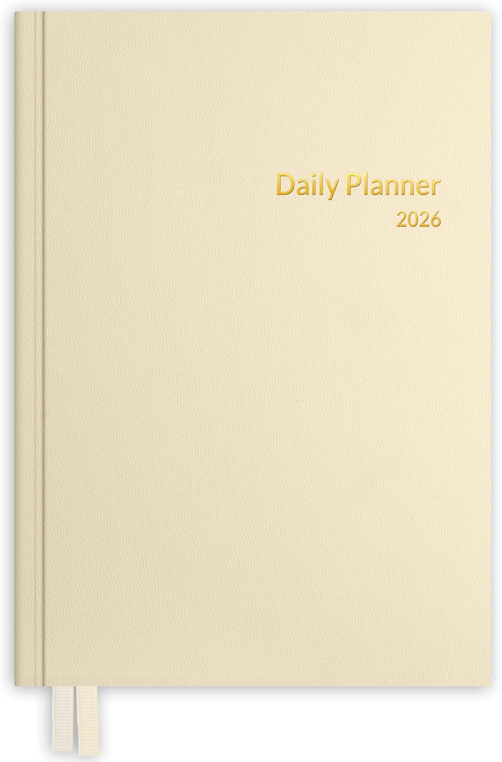 SUNEE 2026 Daily Planner A5 Hardcover – Hourly Schedule Organizer with Monthly Tabs & Task Tracker – Beige Cover Time Management Notebook for Work, School, Personal Goals