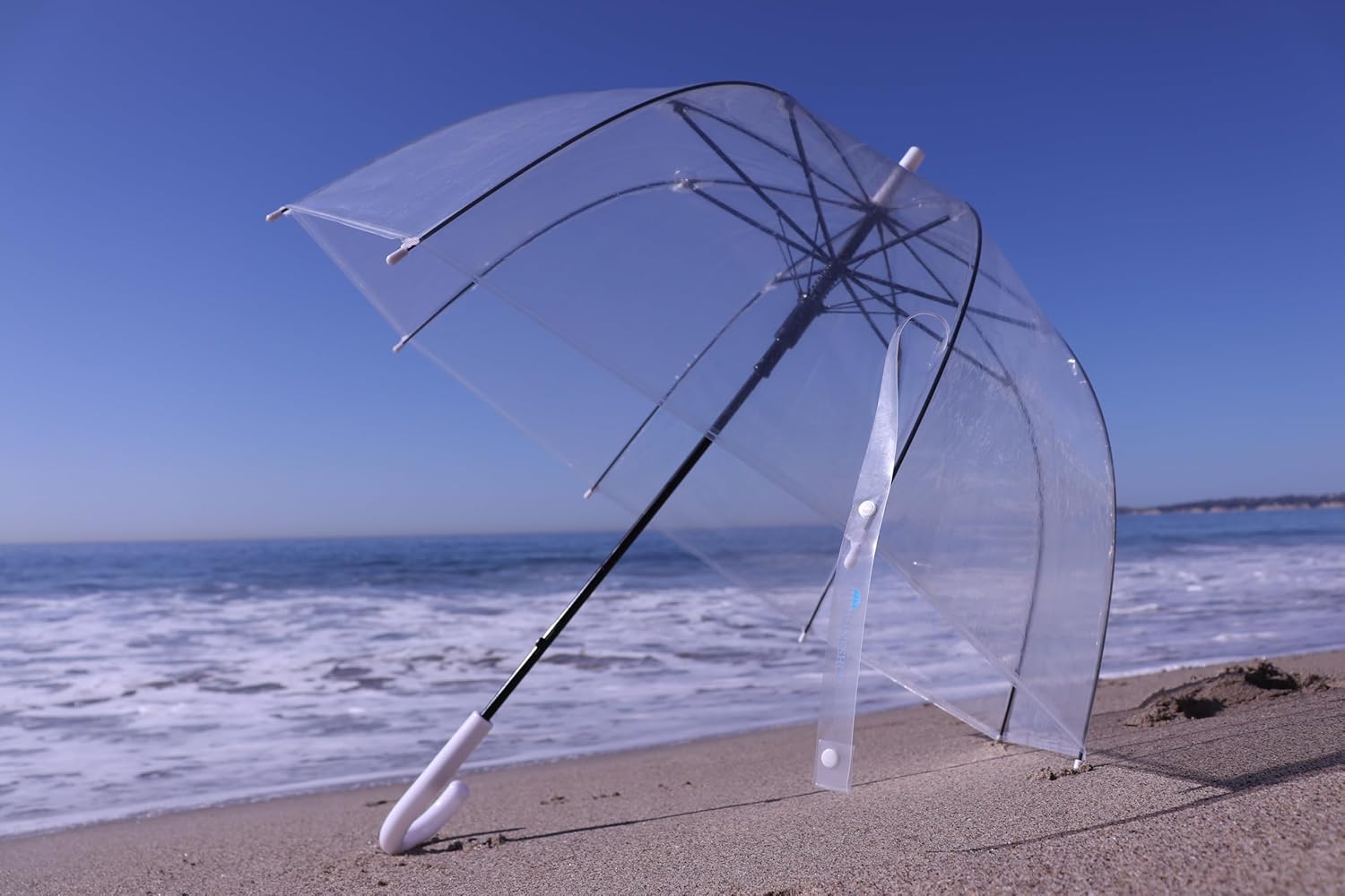 Stay stylish and protected with our Clear Bubble Umbrella, designed to keep you dry while offering full visibility on rainy or windy days. The elegant dome-shaped canopy not only shields your head and shoulders from the rain but also allows you to see clearly, making it perfect for crowded streets, weddings, or scenic beach walks. Crafted with a durable steel shaft and wind-resistant fiberglass ribs, this umbrella stands strong against gusty conditions. The white curved handle offers a classic, comfortable grip, making it easy to carry and hang when not in use. Whether you're heading out for daily errands, capturing Instagram-worthy wedding moments, or simply enjoying a rainy beach day, this transparent stick umbrella adds a blend of fashion and function to your look. It's not just an umbrella—it’s a clear statement of style.