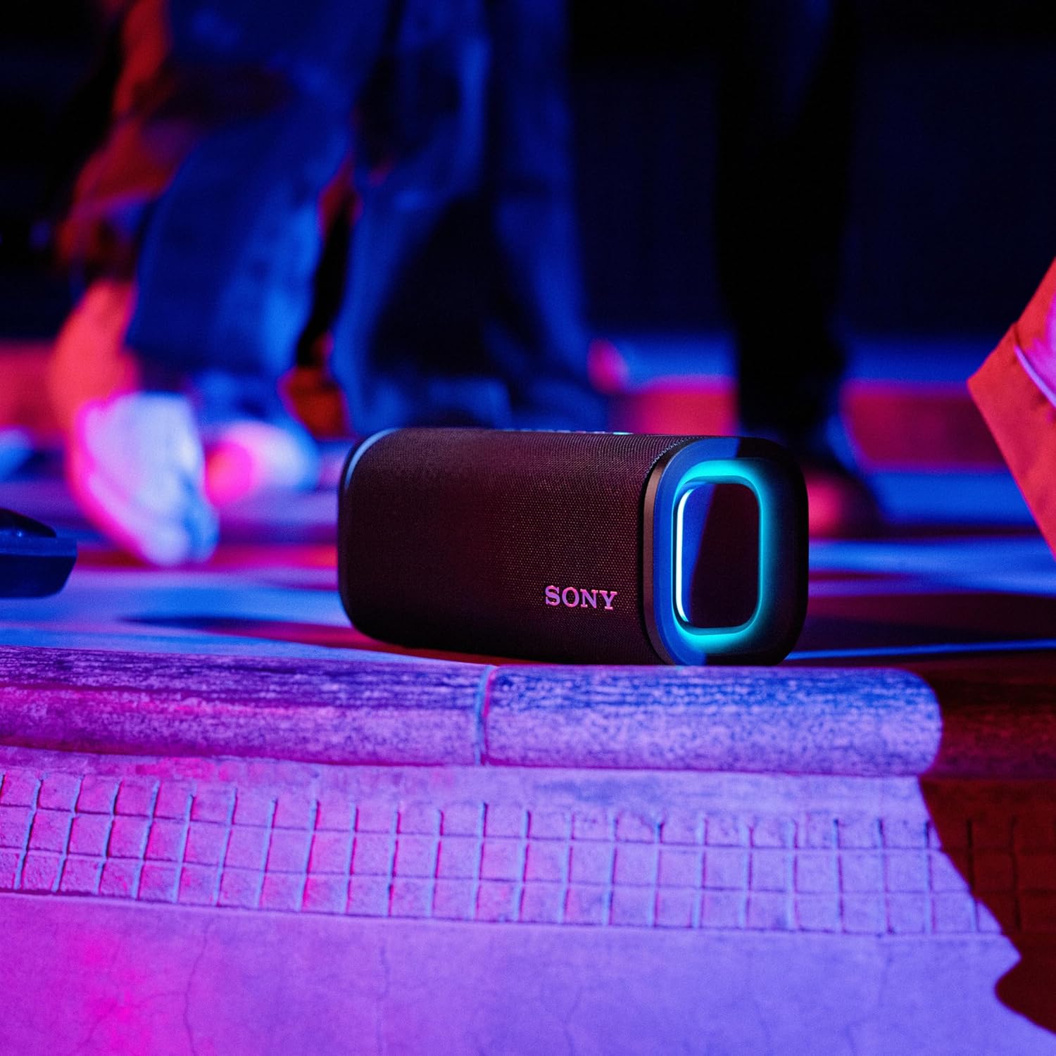 The Sony ULT Field 5 is a portable IP67 waterproof Bluetooth speaker with 25-hour battery life, enhanced bass, 360° party lights, and shoulder strap.