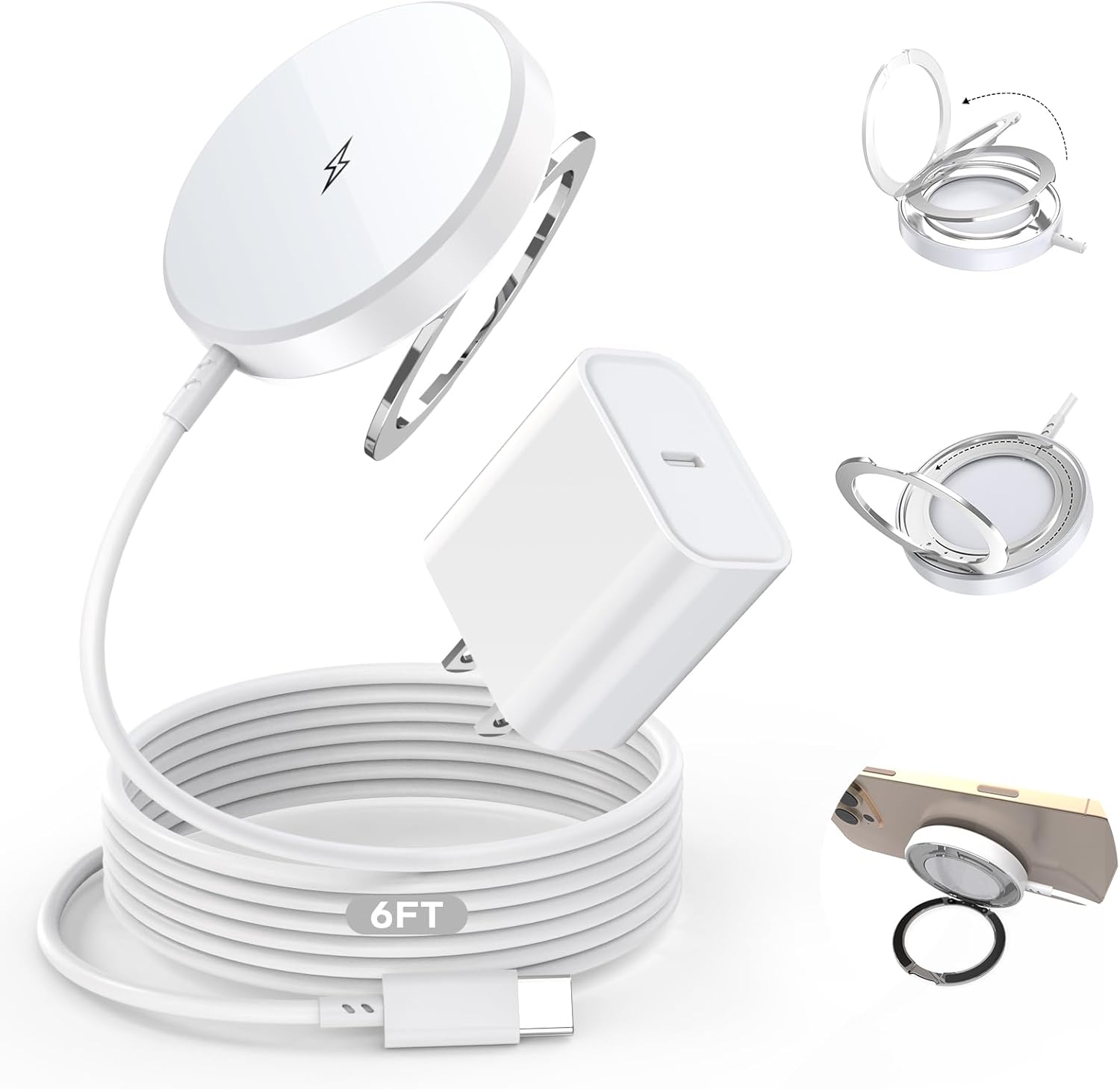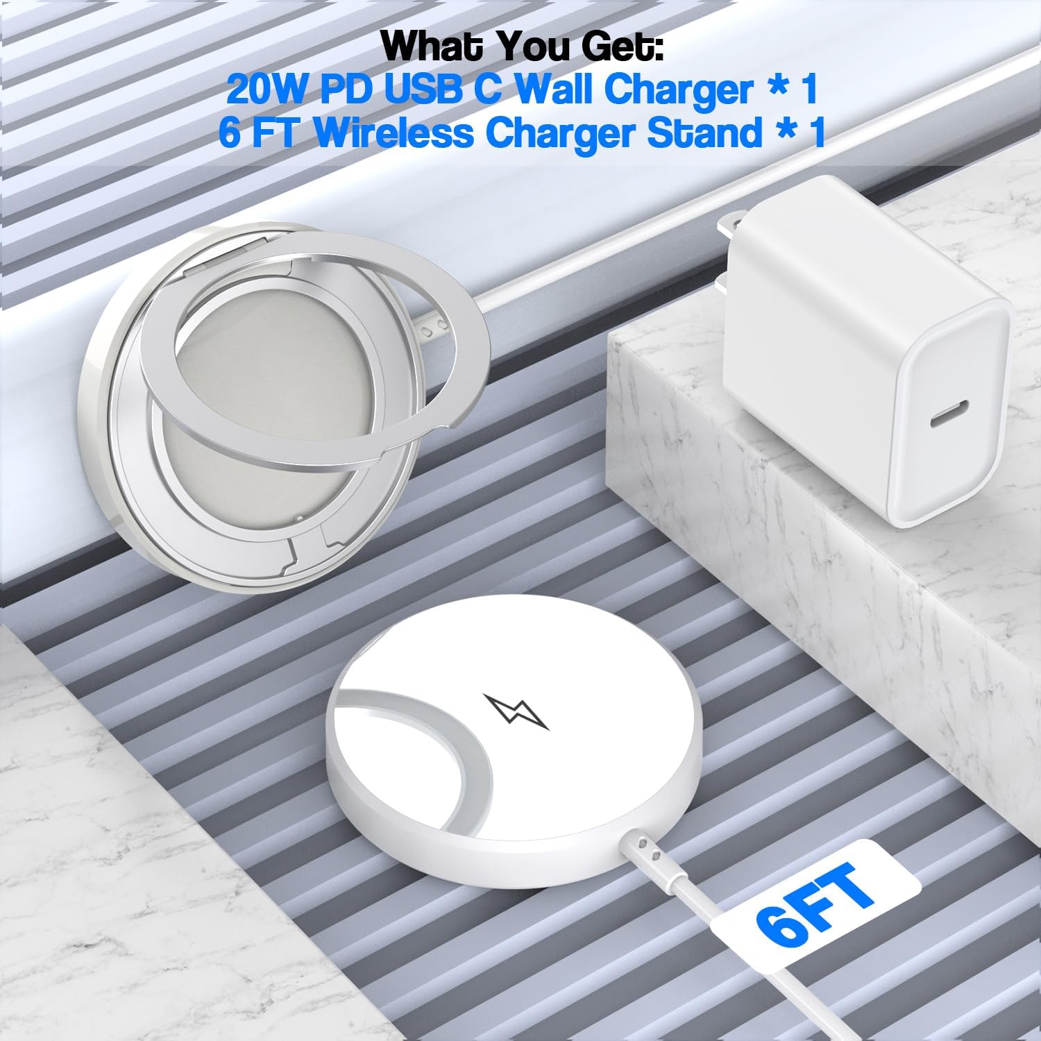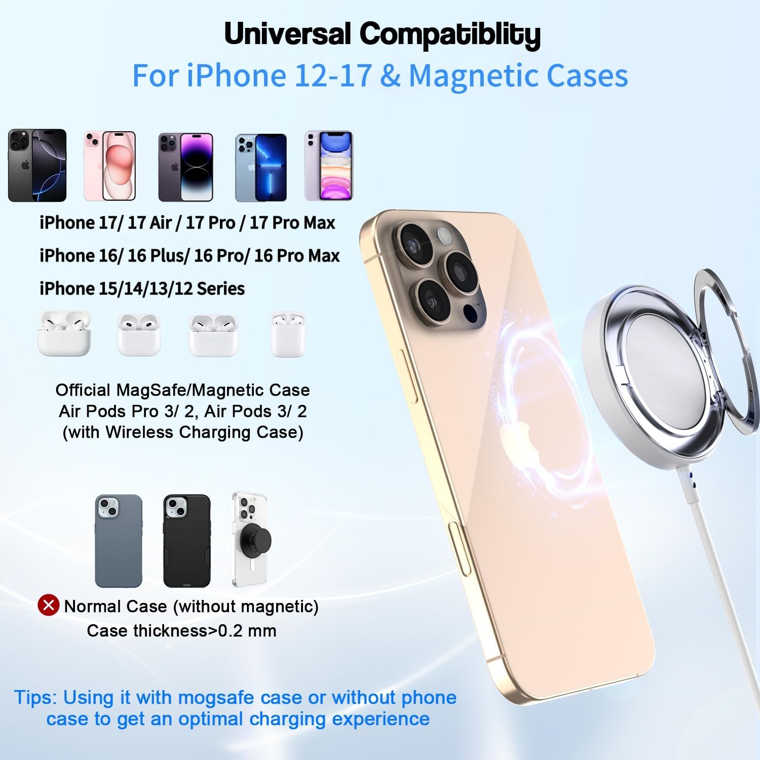 Strong Magnetic Attraction:The strong magnetic suction design ensures a stable fit for safe and reliable charging.This magnetic charging pad for iPhone 17Air uniquely features an aluminum stand,allowing horizontal desktop placement so you can watch videos or read recipes hands-free while charging.Support 360° adjustable rotation and free flipping,the 6Feet Apple Mag-Safe wireless charger stand can switch angles freely to meet your charging needs in any scenario.Safety Efficient Fast Charger:The iPhone17/16 magnetic wireless charger is compatible with the latest devices and has built-in safeguards prevent over-heating,short-circuiting and battery damage.15W Apple Magnetic Charger Cable paired with 20W iPhone USB C wall charger block provides fast charging speeds,charging your iPhone 3X faster than the other iPhone charger.Portable Design with 1.8M/6ft Flexible Charging:The ultra-thin,lightweight design ensures easy portability for business trips or travel.Meanwhile,the 6-foot magnetic wireless fast charging pad for iPhone offers versatile charging flexibility from a distance.Whether you are relaxing on the couch,working at your desk or lying in bed,you can charge your iPhone effortlessly.Universal Compatibility:Magnetic charging for-iPhone 17,iPhone 17 Air,iPhone 17 Pro,iPhone 17 Pro Max-iPhone 16, iPhone 16 Plus, iPhone 16 Pro, iPhone 16 Pro Max-iPhone 15, iPhone 15 Plus, iPhone 15 Pro, iPhone 15 Pro Max-iPhone 14, iPhone 14 Plus, iPhone 14 Pro, iPhone 14 Pro Max-iPhone 13, iPhone 13 Pro, iPhone 13 Pro Max, iPhone 13 Mini-iPhone 12, iPhone 12 Pro, iPhone 12 Pro Max, iPhone 12 MiniWireless charging for(with wireless charging case)-iPhone 11, iPhone 11 Pro, iPhone 11 Pro Max-iPhone X / XS / XS Max / XR / 8 / 8 Plus-Air Pods 3 / 2, Air Pods Pro 3 / 2 and morePackage included:1 x 15W 1.8 M/6ft Magnetic Wireless Charger Cable for iPhone 17/16/151 x 20W PD USB C Wall Charger Adapter