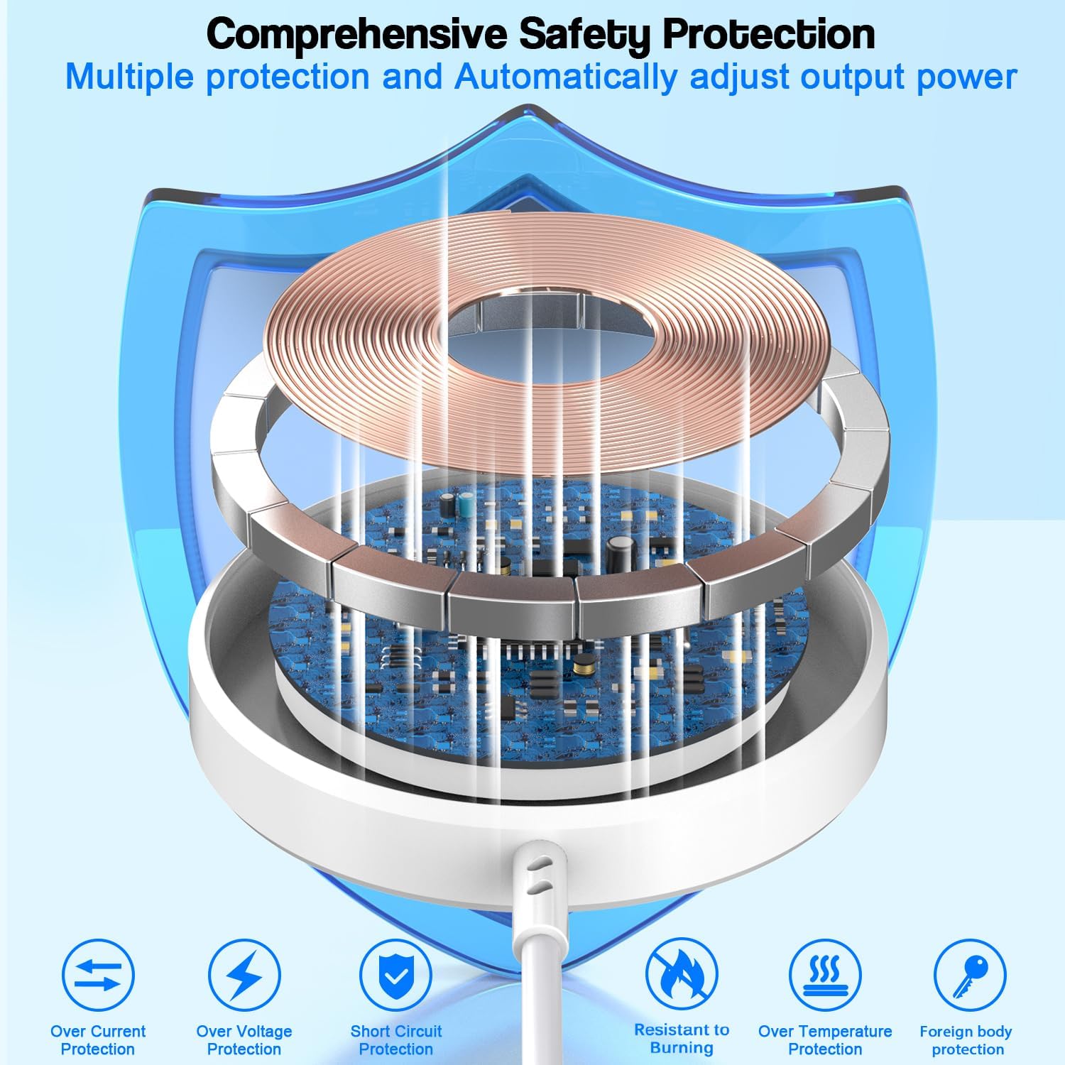 Safer Intelligent Protection System: 1.8m Apple wireless charging pad integrates advanced safety technology to ensure secure,low-temperature charging for your device.The built-in intelligent chipset and charging management system continuously monitor and safeguard against over-charging,over-current,over-voltage,overheating,short-circuits,foreign objects and other hazards.With multi-layer protection,it prevents battery damage while maintaining optimal charging efficiency