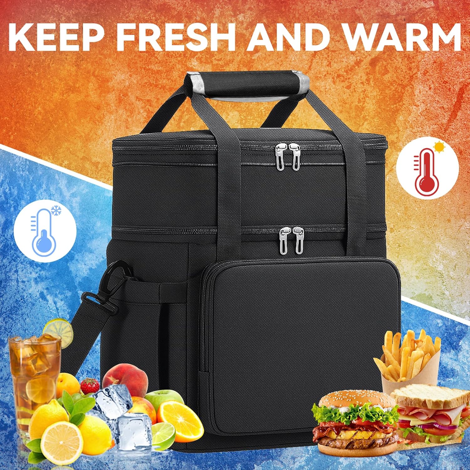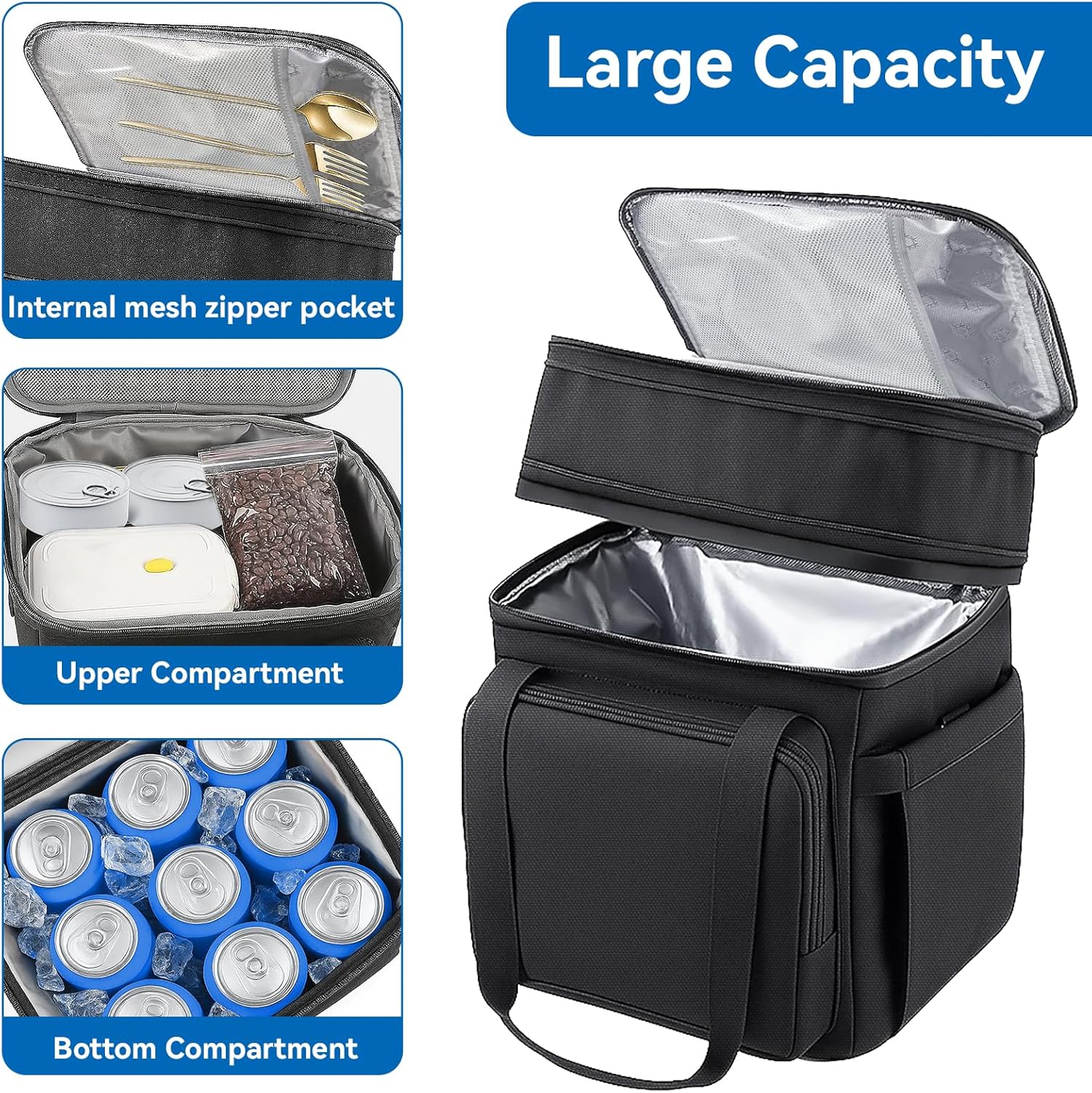 【Large Capacity with Expandable Double Layer】 Normal size with 12L, Expanded maximum size is 16L, fit 20 cola cans(350ml). Dual Compartments for different uses, the top compartment of the insulated lunch bag is expandable, increasing the capacity by 4L. The lunch bbox can handy to use for work, outing, small trip, picnic, camping, hiking