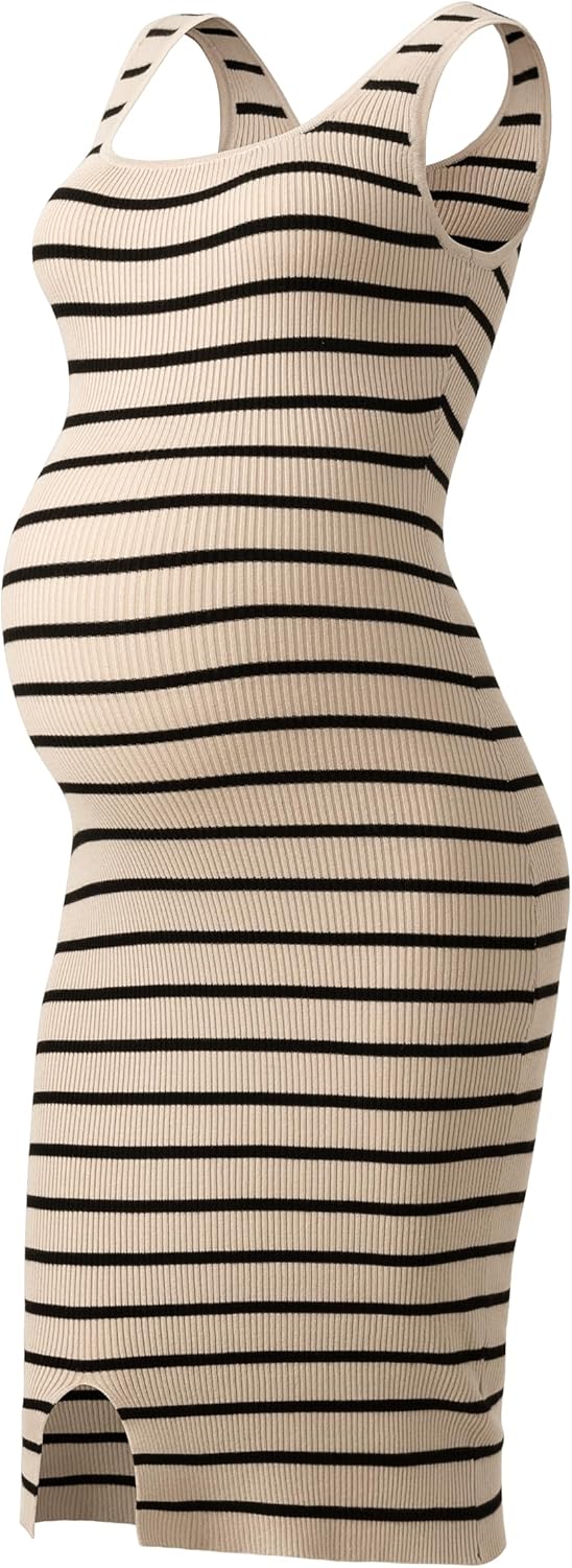 SUNNYBUY Women's Striped Maternity Dress Summer Tank Bodycon Dresses Knit Slit Pregnancy Clothes, Apricot Black Stripe Tall S