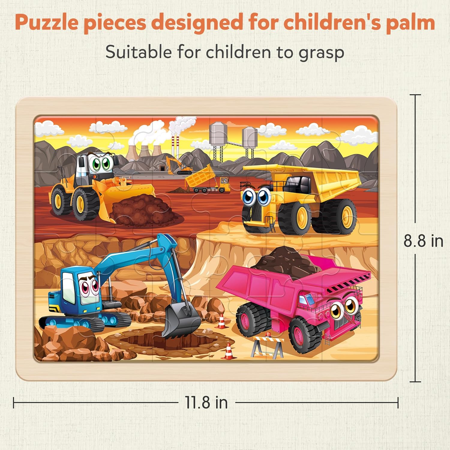 SYNARRY Large Wooden Construction Vehicle Puzzles for Toddlers 3-5, 24 Piece Monster Truck Puzzles for Kids Ages 4-6, Construction Toys for 3 4 Year Old, Kids Toys Gifts for 3 4 5 Year Old Boys Girls