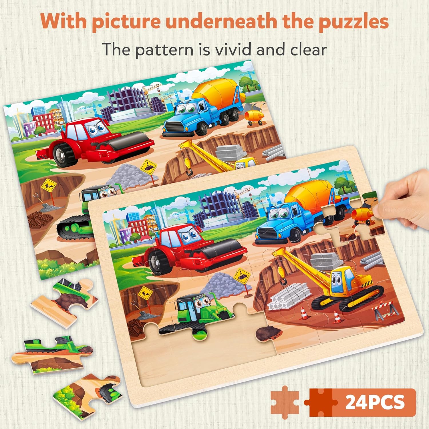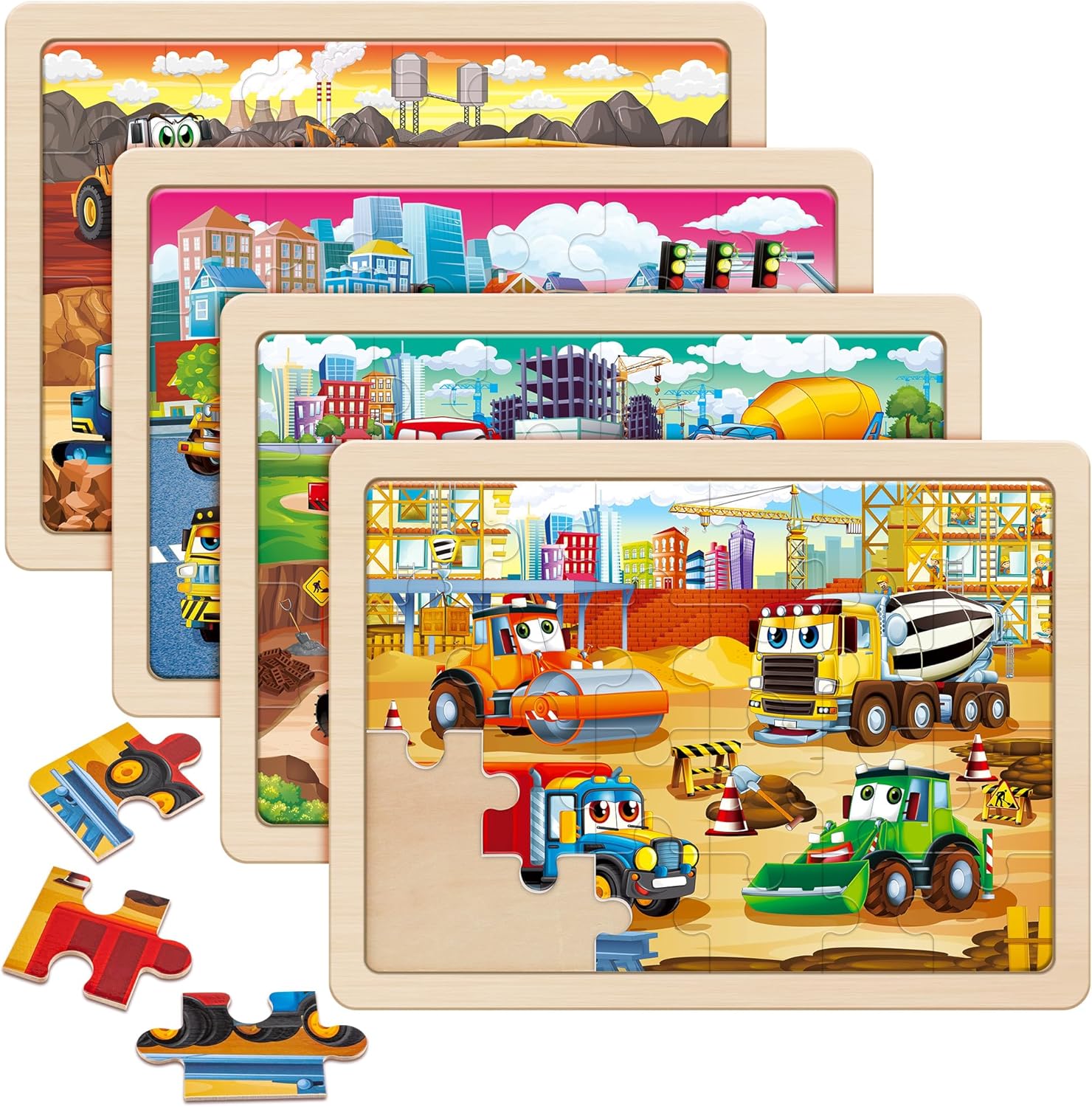 FUN WOOD PUZZLES FOR KIDS: The wooden puzzle set contains 4 packs of 24 durable and bright wooden jigsaw pieces that fit smoothly together when assembled to show 4 appealing themes of construction site, urban roads, quarry, homestead construction. All in a colorful box.