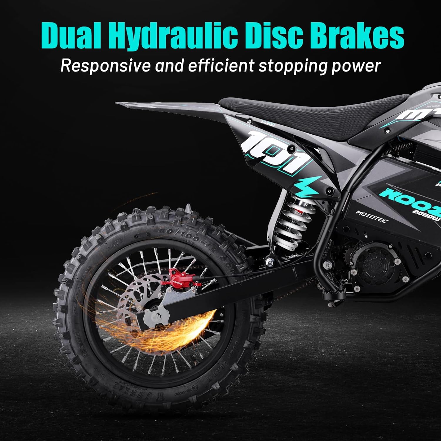 Advanced Suspension for Smooth & Stable Ride: The KOOZ dirt bike comes with a comprehensive full suspension system, meticulously designed to handle the most challenging terrains. It features dual hydraulic shocks in the front and a high - performance single rear hydraulic shock. Working in harmony, these components adeptly absorb bumps, dips, and uneven surfaces. Whether you're traversing gravel, dirt, or rocky trails, this setup guarantees a smooth, stable, and fully - controlled ride