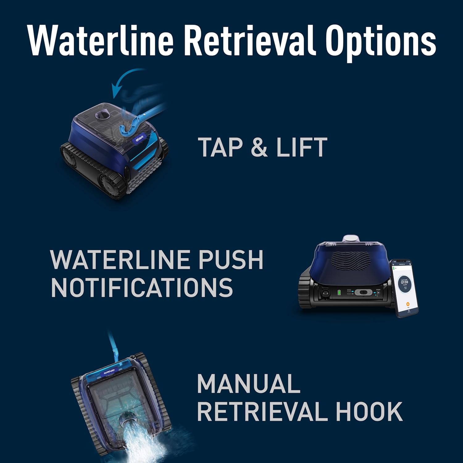 Tap & Lift Removal System: For convenient retrieval at the waterline when cleaning is done — simply tap the cleaner and watch it climb up the wall to you so you can easily grab the handle as water quickly evacuates for lightweight removal.