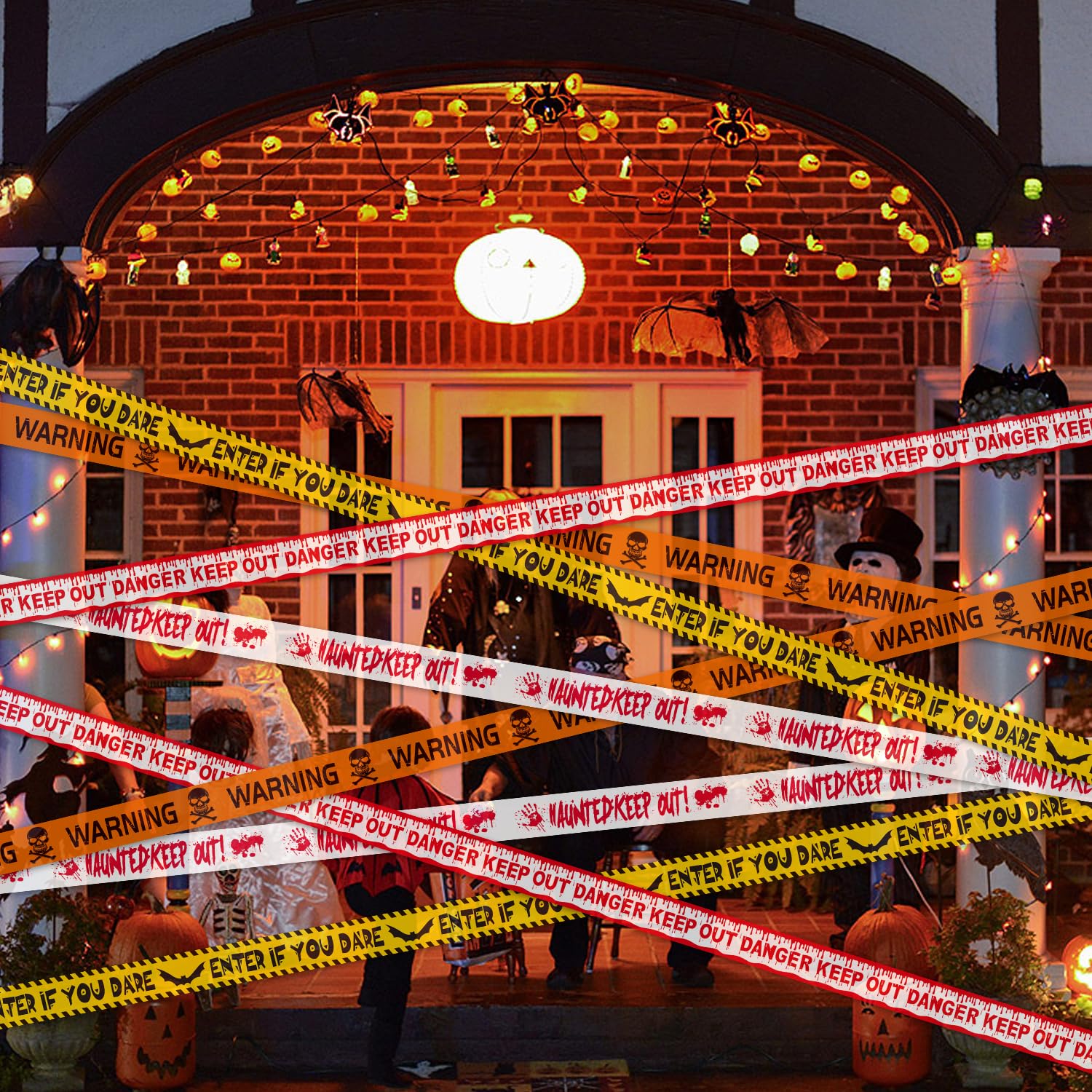 Halloween Fright Caution Tape: 4 different designs "WARNING" "HAUNTED KEEP " "ENTER IF YOU DARE" "DANGER KEEP OUT" you can create a spine-chilling atmosphere, added some more fun to holiday decorations.