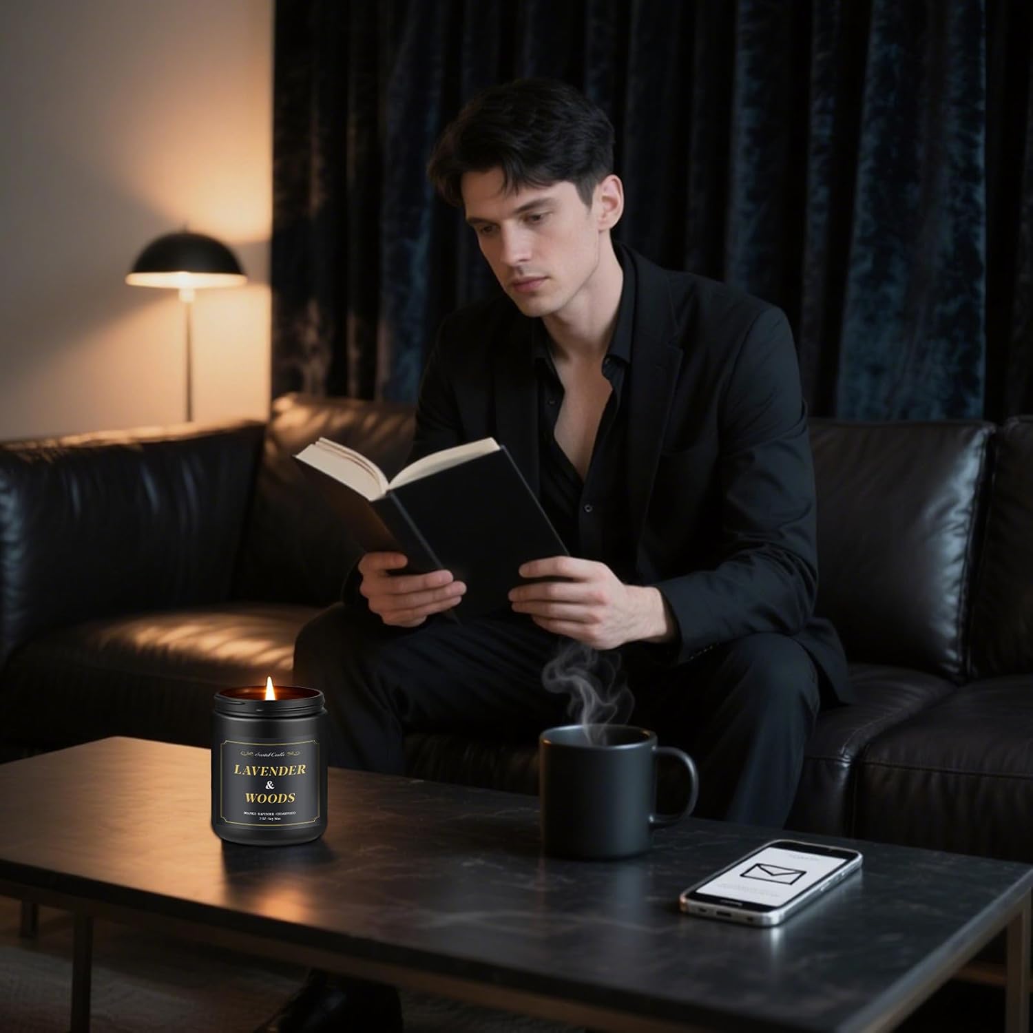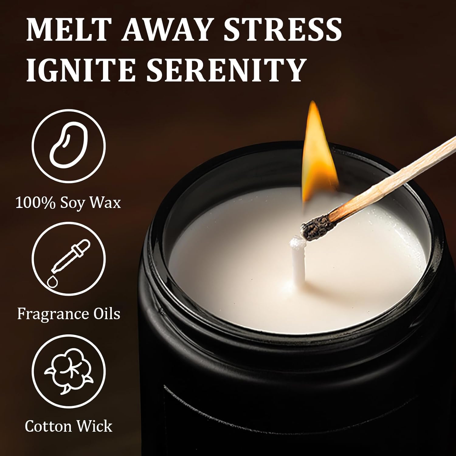 [Stress Relief & Aromatherapy Candles]: Crafted from pure plant-based fragrance oils and 100% natural soy wax, these scented candles for men burn cleanly without black smoke. The soft candlelight intertwines with soothing fragrance, help to melt away tension and sharpen mental clarity while cocooning your space in serene comfort