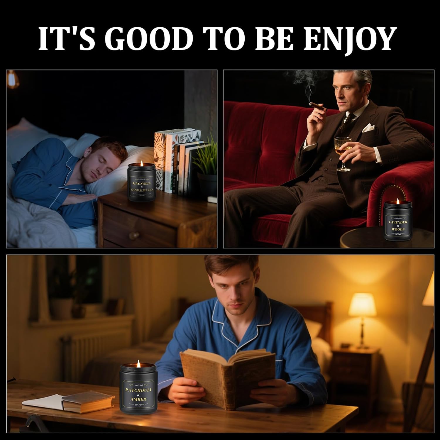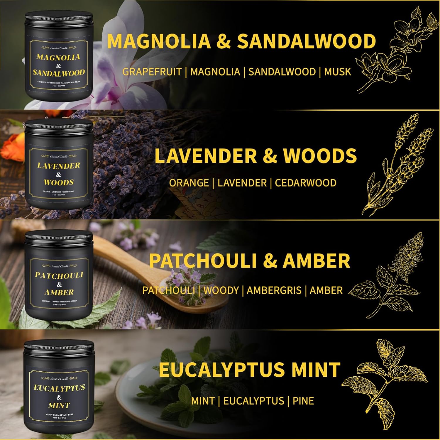 [Fragrance Mens Candles Set]: Experience masterfully blended masculine scents designed for the modern gentleman: Lavender Woods, Magnolia & Sandalwood, Patchouli & Amber, and Eucalyptus Mint. Each fragrance elevates any space into a refined haven of calm and focus, encapsulating timeless masculinity. Candles for men also can create an inviting and relaxing environment, effectively relieve stress, improve concentration, and bring a deep relaxation experience