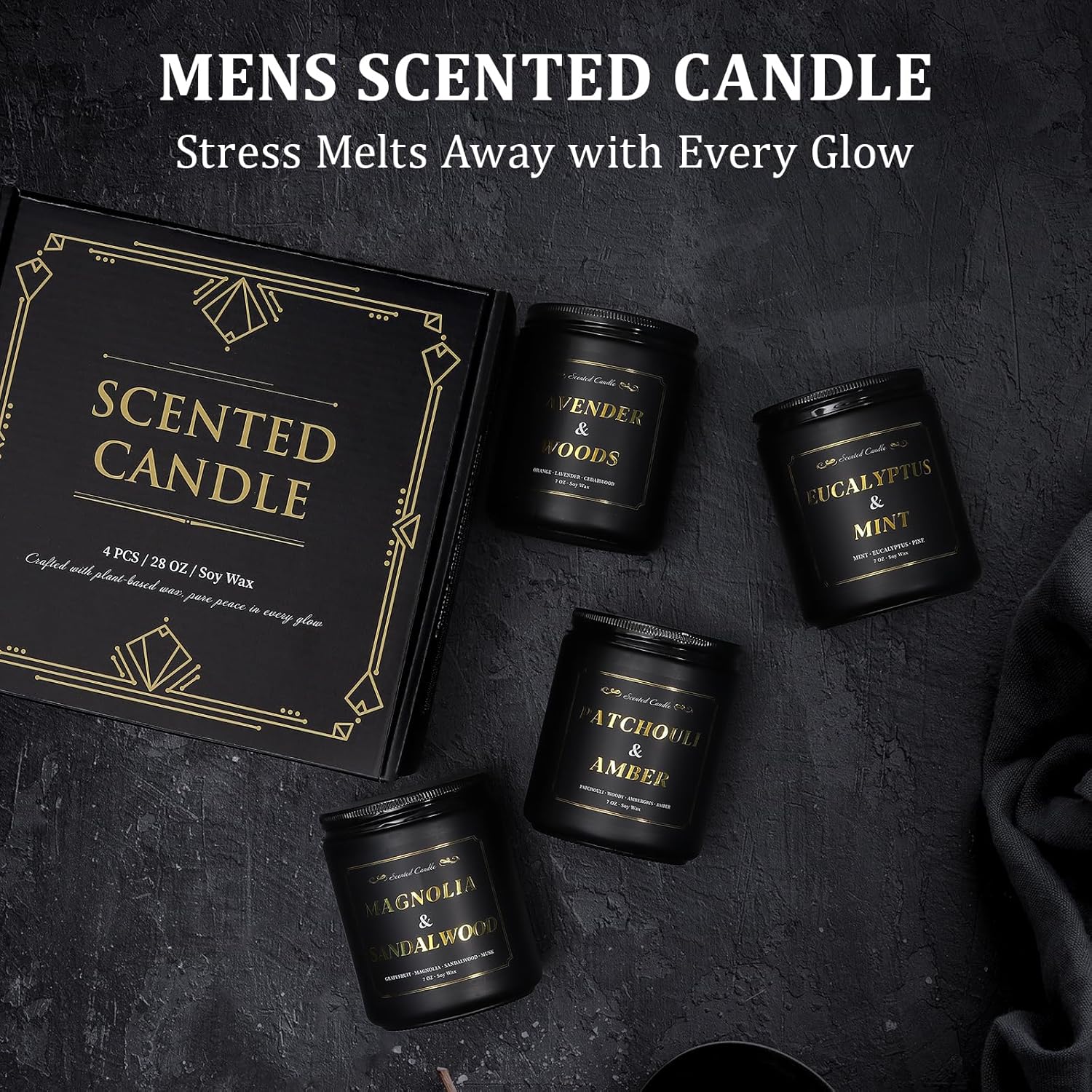 Scented Candles for Men, 4 Pack Mens Candles for Home Scented, 28oz Soy Wax Candles Set - Lavender/Patchouli/Sandalwood/Eucalyptus, Aromatherapy Candles Gift Idea for Dad, Husband, Boyfriend