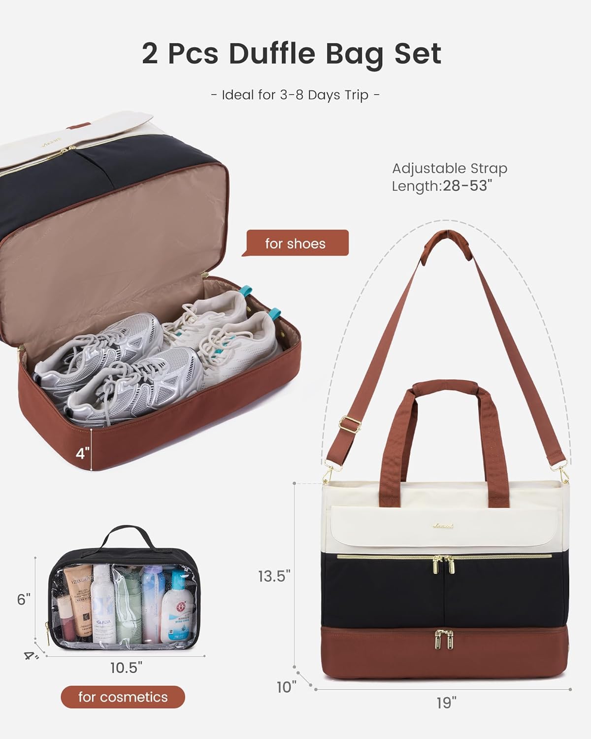 【Large Capacity for 3-5 Days Travel】This duffle bag measures 19×13.5×10 inches with a 42L generous capacity. The multi-pocket design helps you neatly organize essentials for 3-5 day trips. Comes with a free toiletry bag for cosmetics storage, making it perfect for travel.