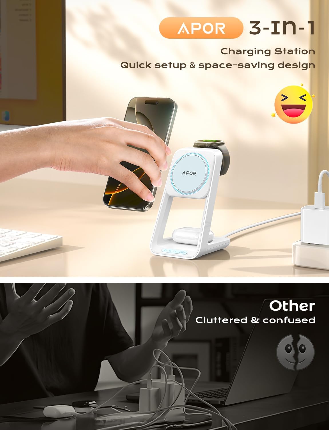 3-in-1 Wireless Charging Station – Power your iPhone, Apple Watch, and AirPods all at once in one sleek charging hub. Designed for Apple users, this compact station keeps your desk, nightstand, or travel setup organized and clutter-free, replacing messy cables with one simple solution. Compatible with iPhone 16/15/14/13/12 series, Apple Watch Ultra 2/10/9, and AirPods Pro/3/4.