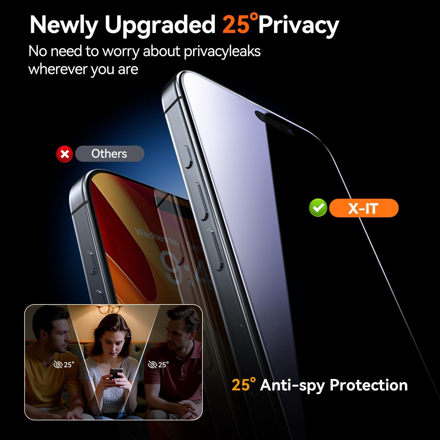 X-it 4-Pack Privacy Screen Protector for iPhone 15 Pro Max,[Military Grade Shatterproof],9H+ Tempered Glass,[Automatic dust Removal], 10x Military Protection, [Bubble-Free], Easy to Install,Case Friendly