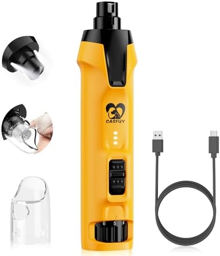 Casfuy 6-Speed Dog Nail Grinder – 50%+ Boost Power Dog Nail Trimmers Quiet with Dust Cap & 2 LED Lights & 2000mAh Battery & 4.8V Motor Electric Pet Toenail File Tool for Large Medium Small Dogs Cats