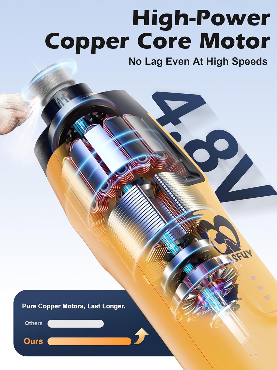 【4.8V Copper Core Motor - No Lag, More Power】Enhanced with 50% more torque, our powerful dog nail trimmer easily handles thick, tough nails. The durable copper core delivers smooth, stable grinding for an effortless grooming experience—even at high speeds—without stalling or slowing down.