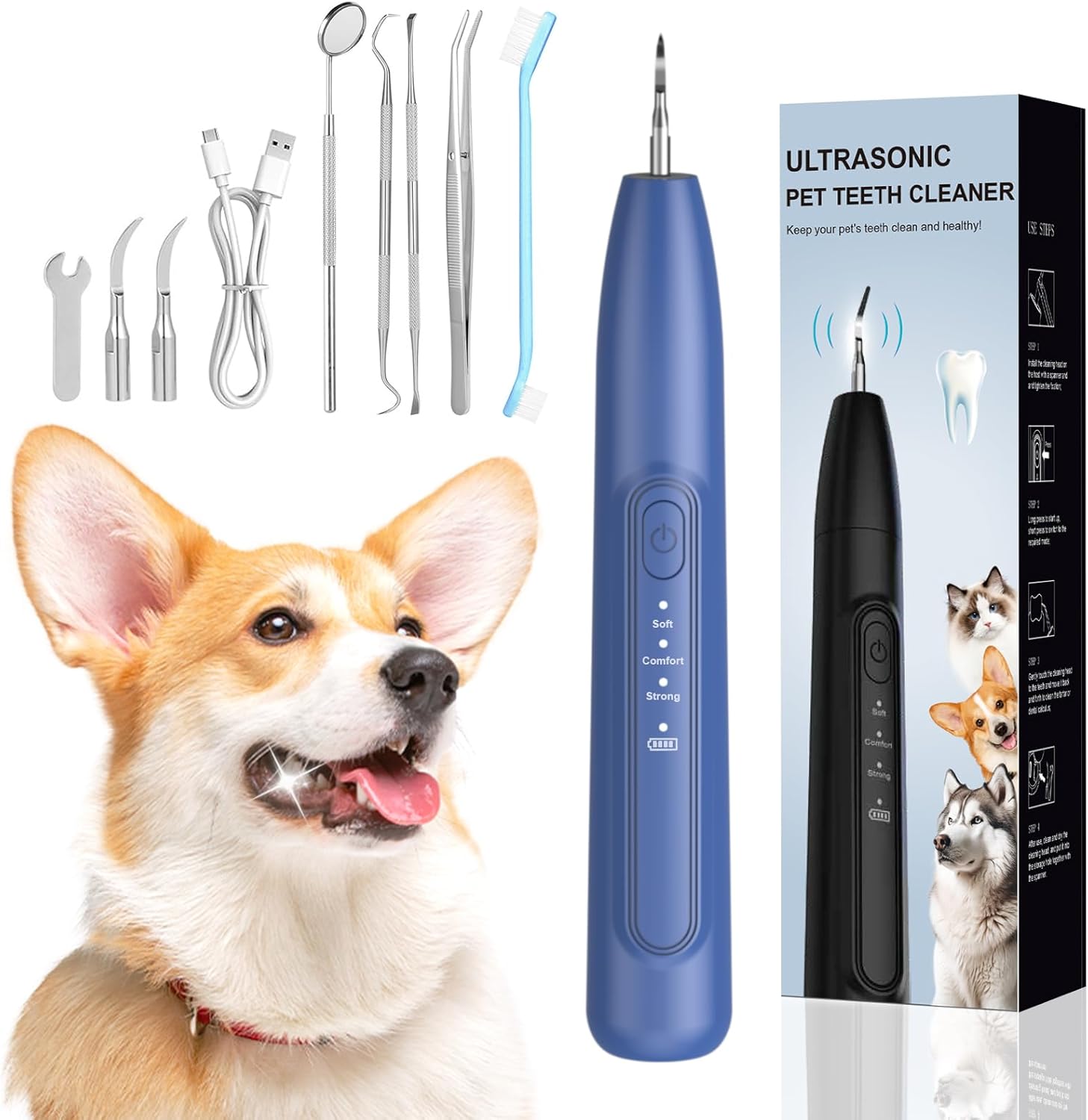 🧰【High Efficiency Ultrasonic Pet Teeth Cleaner】This sonic tooth cleaner for dogs employs a safe deep-cleaning technology that vibrates up to 2,000,000 times per minute. And this comprehensive dog teeth cleaning kit is equipped with 1x dog tooth cleaner, 2x cleaning head, 1x dental mirror, 1x dental probe,1x dental scraper, 1x dental tweezer and 1x double-ended toothbrush. With this multi-functional dog teeth tartar remover, you can guarantee a professional teeth cleaning for your furry friends