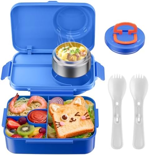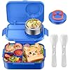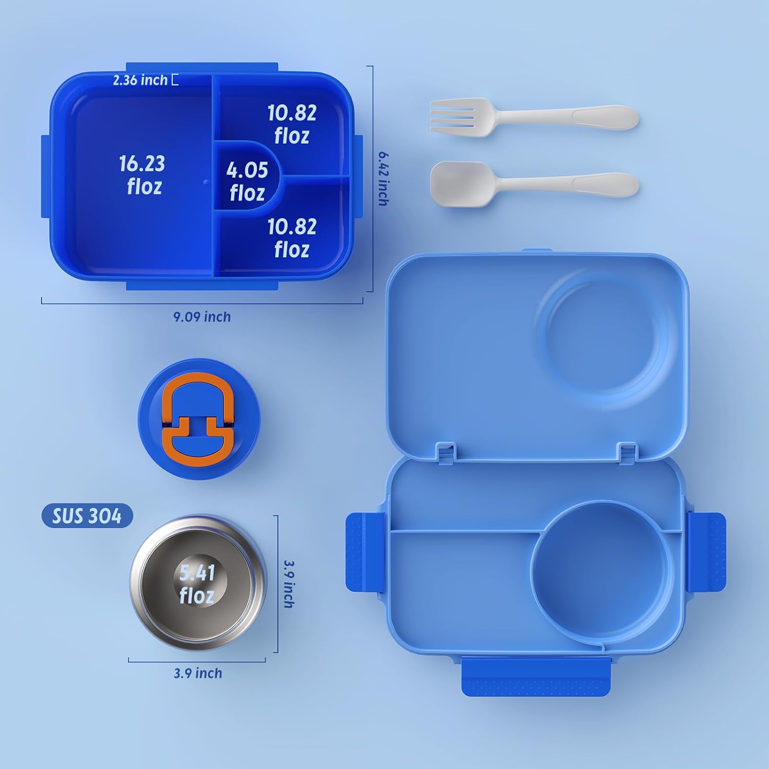 DaCool Upgraded Kids Lunch Box with Thermo for Hot Food 1400ml Child Bento Box for Kids with 5oz Small Thermo for Boys Girls with Fork Spoon Leakproof for Dining Out School Work Picnic, Blue