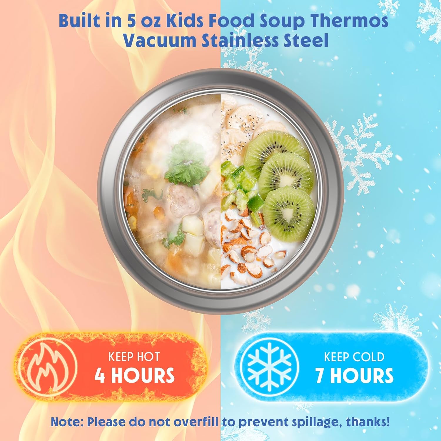 Built in 5 oz Kids Insulated Food Jar for Hot/Cold Food and 2 Important Tips -- Built in removable kids thermo for hot food vacuum stainless steel insulated food jar lunch containers. 18/8, 304 grade stainless steel. 1. IMPORTANT TIPS to keep food hot & cold for longer time:Please pour in boiling & cold water to preheat & pre-cool this for this 5 to 10 minutes before packing food. 2. Note: Please do not overfill to prevent spillage, thank you for your attention