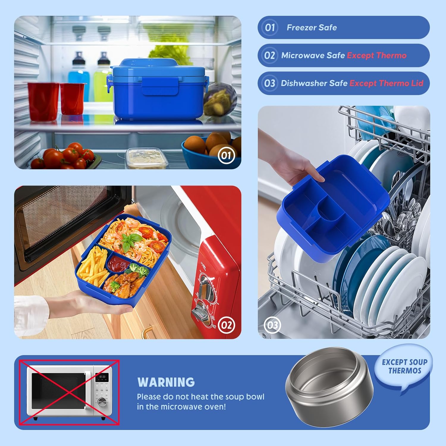 Dishwasher & Microwave & Freezer Safe -- Note: Dishwasher safe but except for the thermo lid, bentobox is Microwave but except for the food thermo. Premium food grade material bento lunch box for kids can be heated in microwave to help you eat hot lunch, can be stored in freezer to keep food fresh, can be washed in dishwasher help free and protect your hands and save your precious time perfectly. Please remove the lid when heating, avoid that the steam generated during heating cannot be dissipated because the lid is too tight, thank you