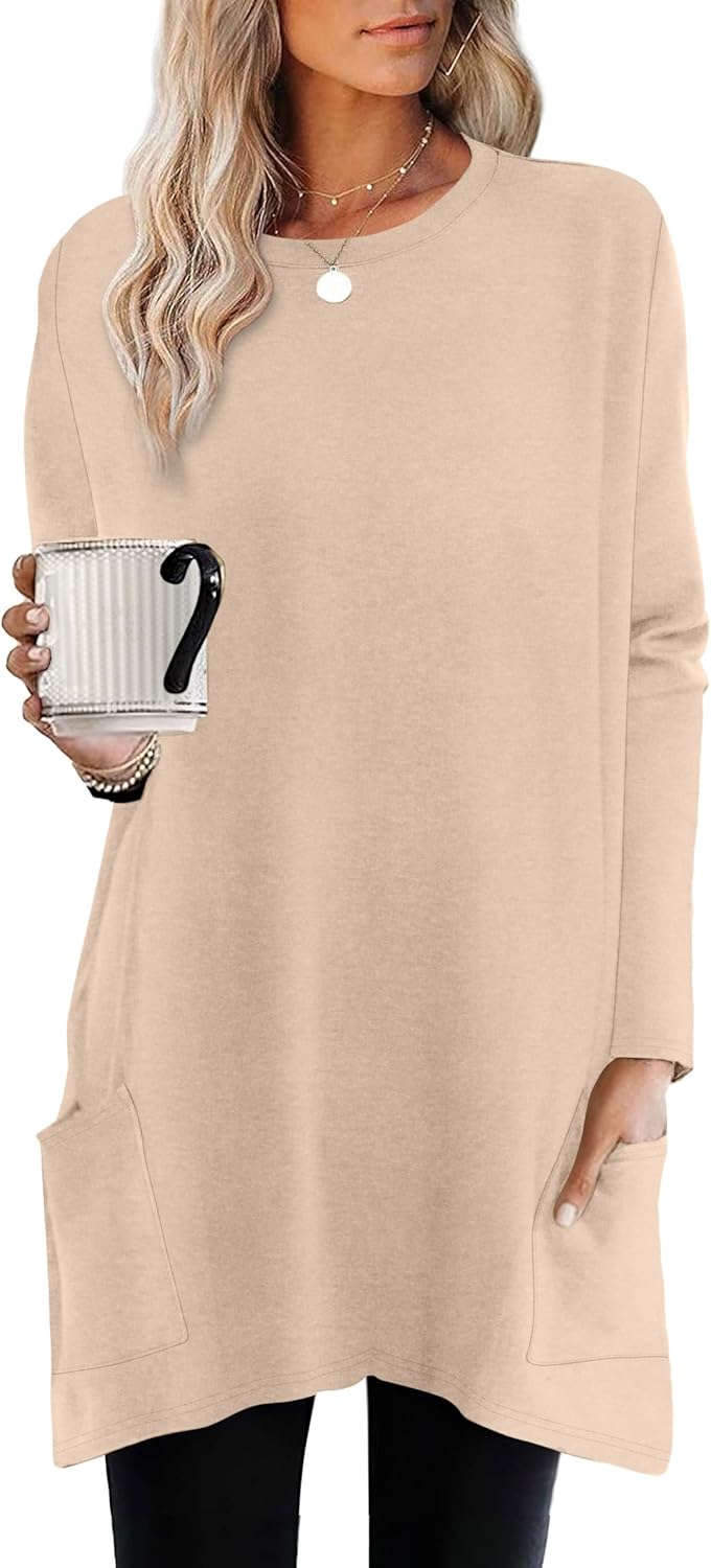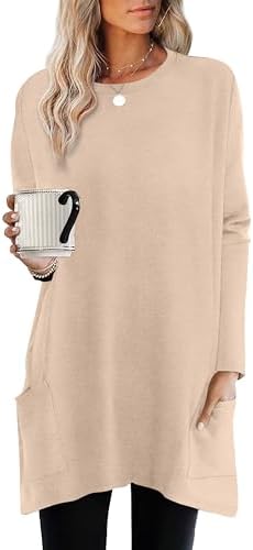 XIEERDUO Womens Tunic Tops Long Sleeve Crew Neck High Low Hem Loose Fit Shirts Blouses with Pockets