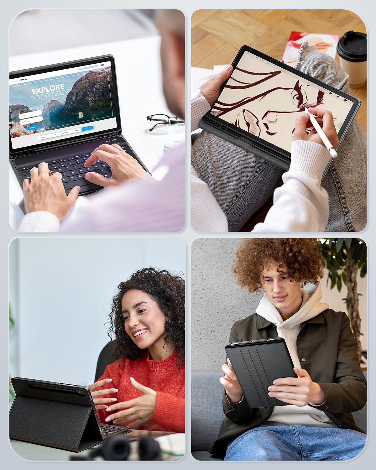 ⌨【Magnetically Detachable Keyboard】case for Samsung Galaxy Tab S10 FE+ Plus 13.1 inch comes with a detachable magnetic keyboard. The ultra-thin and lightweight magnetic keyboard can be firmly attached to the case, which helps the tablet stand upright and turn it into a mini laptop in less than a second. You can move and change the keyboard position at any time according to your usual preferences
