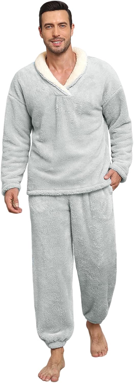 Mens Pajamas Set Long Sleeve Soft Fleece Fluffy Sleepwear Winter Warm Pjs Lounge Sets Flannel Sleepwear with Pockets