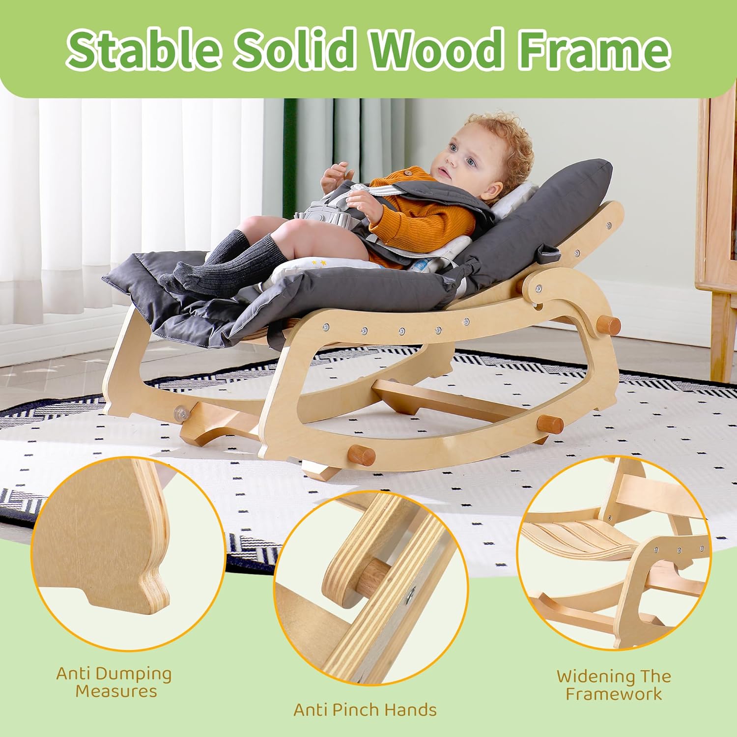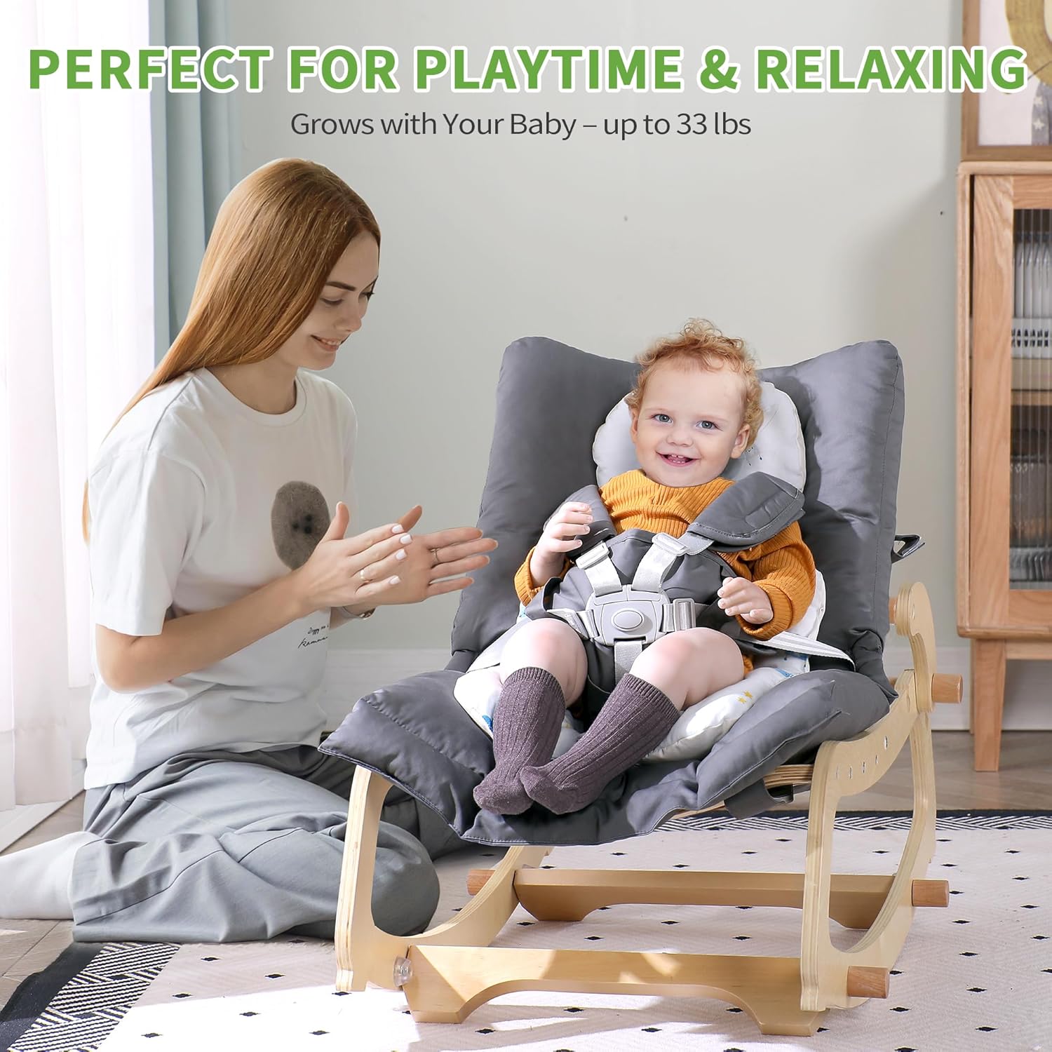 MallBest 3-in-1 Baby Double Cushions Bouncer Adjustable Wooden Rocker Chair Recliner with Removable Cushion and Seat Belt for Infant to Toddler (Grey)