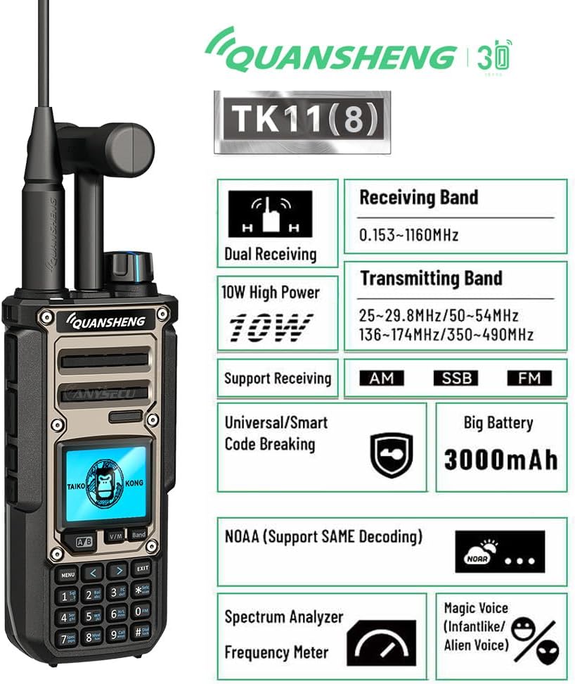 Quansheng UV-TK11 (8) UHF VHF 10W High-Power Walkie Talkie with NOAA 999 Programmable Channels, Voice Prompts, USB-C Fast Charging Rugged for Outdoor, Emergency & Group Use
