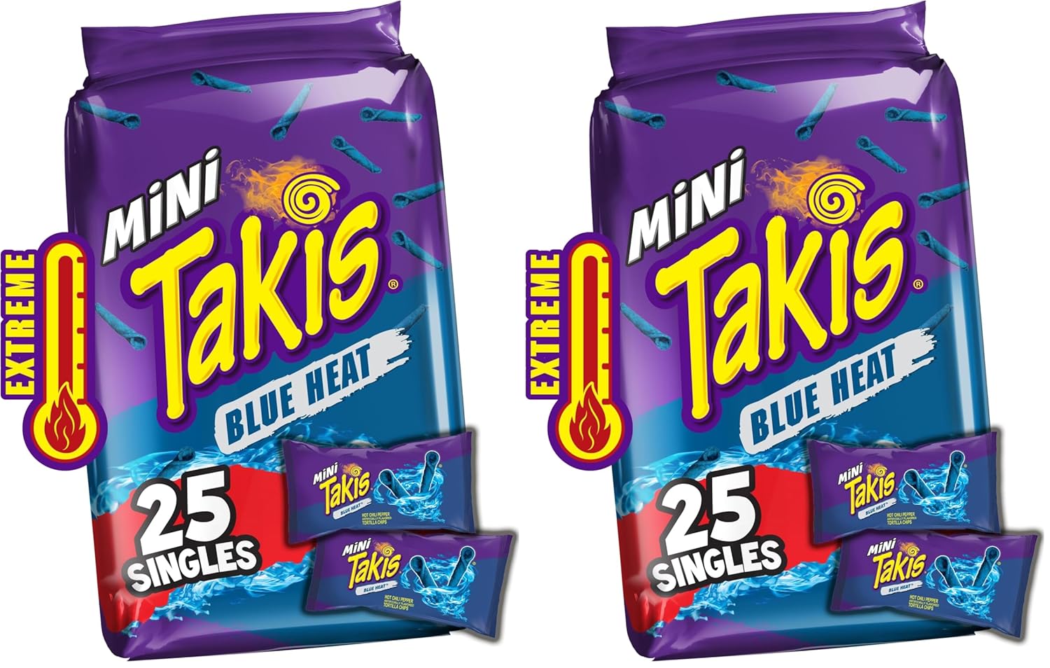 Takis Blue Heat Mini 25 pc / 1.23 oz Bite Size Multipack, Hot Chili Pepper Flavored Extreme Spicy Rolled Tortilla Chips (Pack of 2)