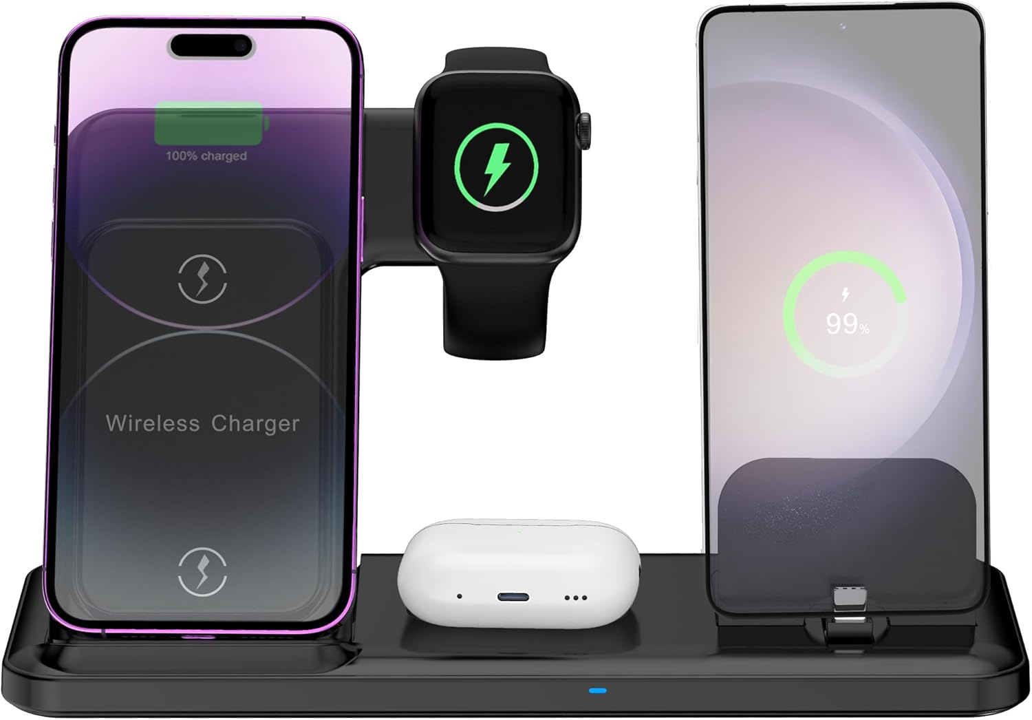 Universal Compatibility with Apple and Android Devices: This wireless charging pad supports a wide range of Qi-enabled phones including iPhone 16e/16Plus/16/16 Pro/16 Pro Max/15Plus/15/15 Pro/15 Pro Max/14Plus/14/14 Pro/14 Pro Max/ 13Plus/13/13 Pro/13 Pro Max/13 mini/12Plus/12/12 Pro/12 Pro Max/12 mini/iPhone 11 Pro Max/11 Pro/11/XS/XS Max/XR/X/8 Plus/8 and Samsung Galaxy S24+/S23/S22 Ultra/Note 20/Note10. Compatible with Apple iWatch Series Ultra/SE/10/9/8/7/6/5/4/3/2, AirPods Pro/4/3/2, and any earbuds supporting wireless charging. Whether you’re an Apple or Android user, this is the ultimate wireless charging station for everyday convenience.