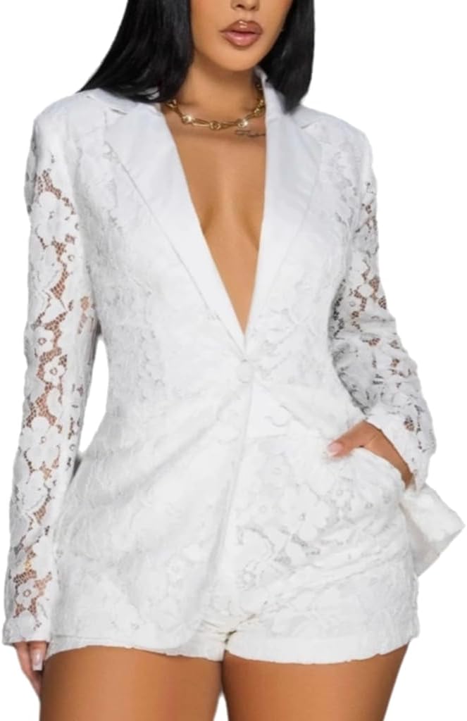 Blazer Shorts Set for Women Lace V Neck Long Sleeve Blazer Bodycon Shorts Suits Womens Business Casual Outfits White