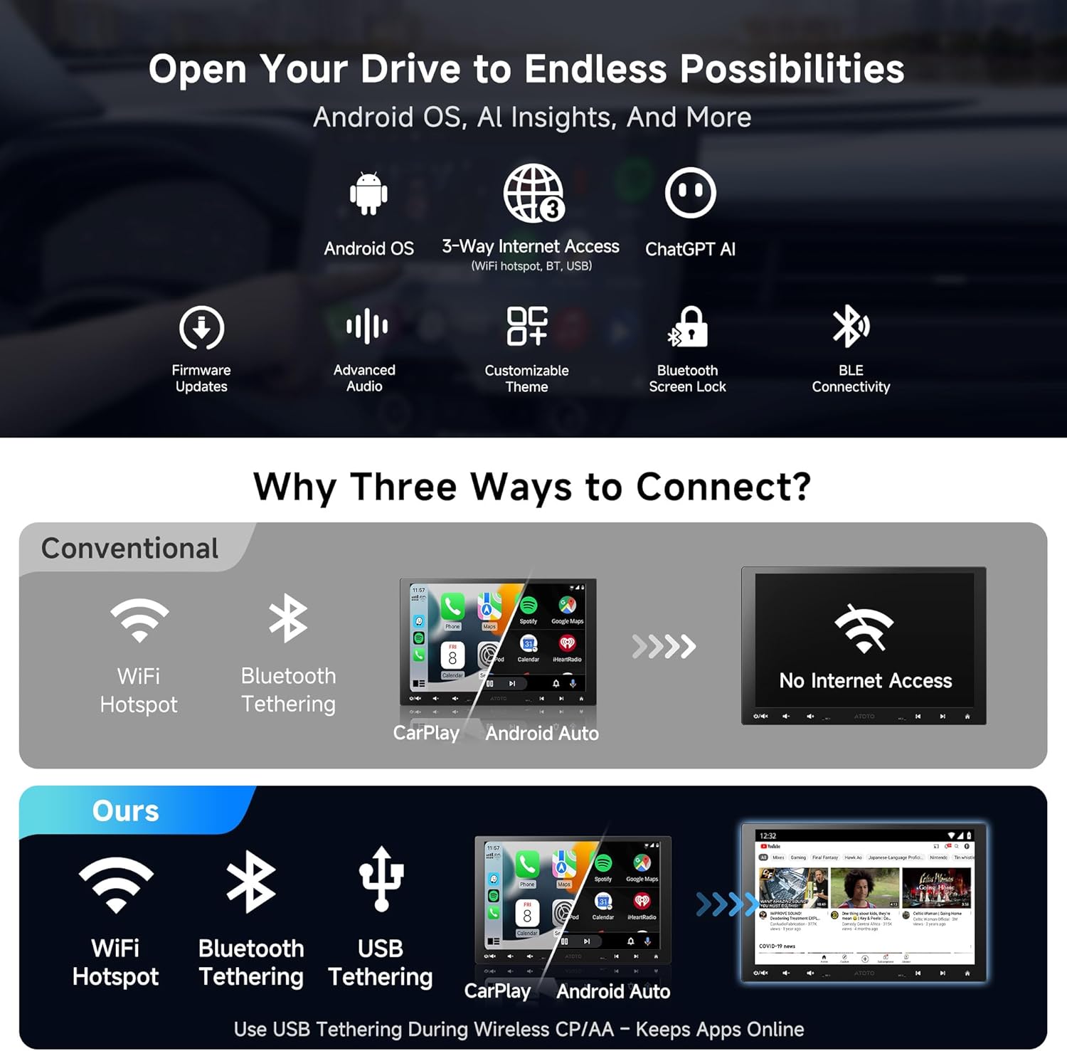 Wireless CarPlay & Android Auto, MirrorLink: Wireless CP/AA via Bluetooth for quick access to maps, calls, and music. MirrorLink expands app options. With a USB-to-HDMI adapter (not included), enjoy different content front and rear—great for family trips