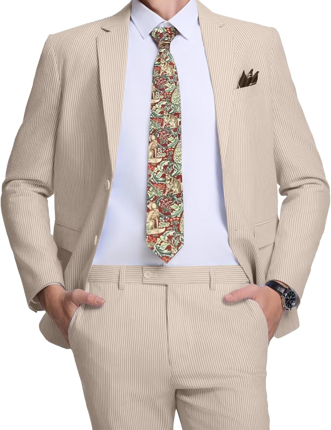 Wehilion Blue Seersucker Suits 2 Piece Casual Summer Beach Men Suits Wedding Grooms Jacket Pants Striped Suit Set