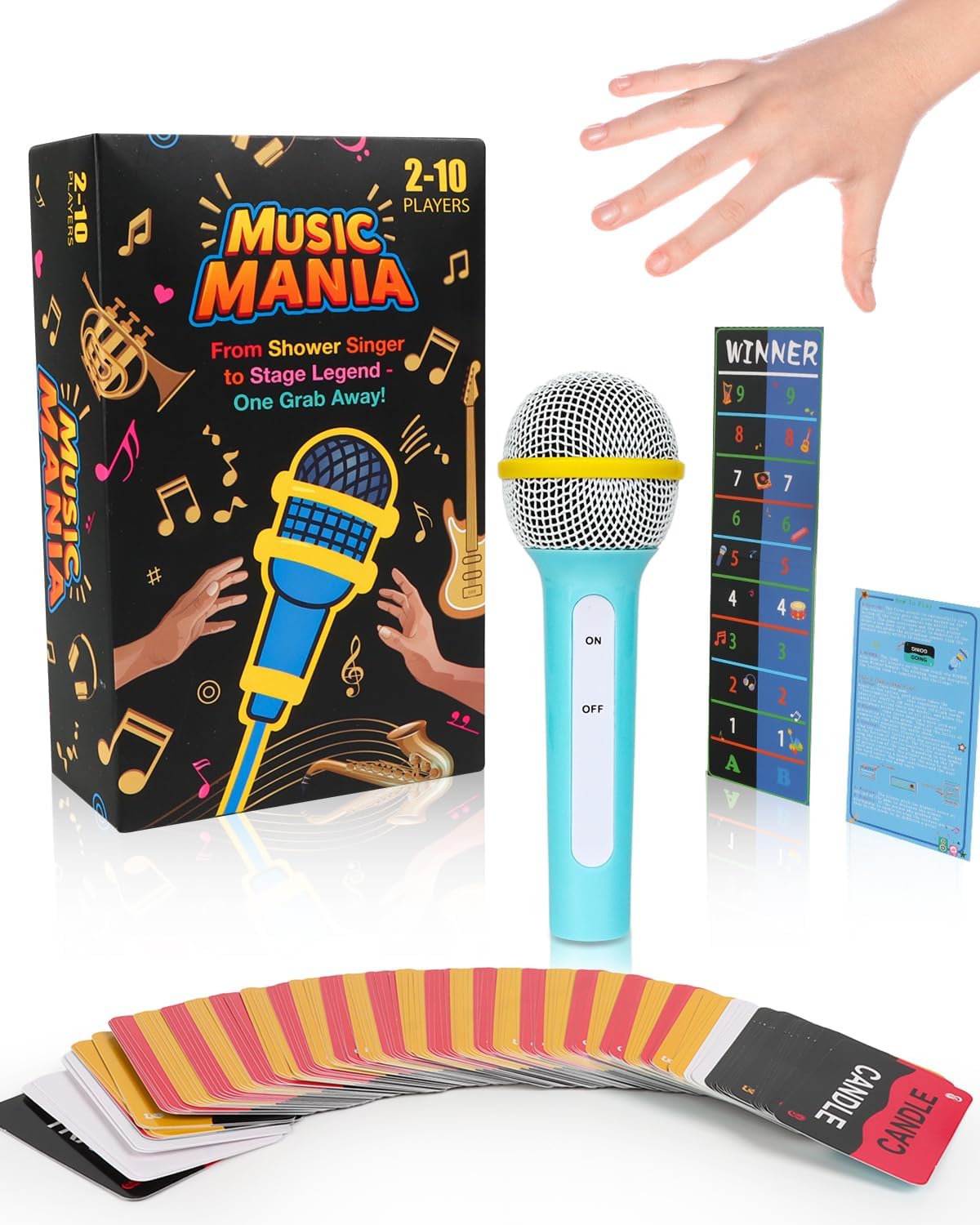 Everyone’s Game – No Vocals Required: Can’t sing? You’re not alone. This music card game rewards creativity, not pitch. Flip a card, spot the keyword, and be the first to grab this microphone and sing a matching lyric. Funny? Off-key? Doesn’t matter—just keep the energy alive.