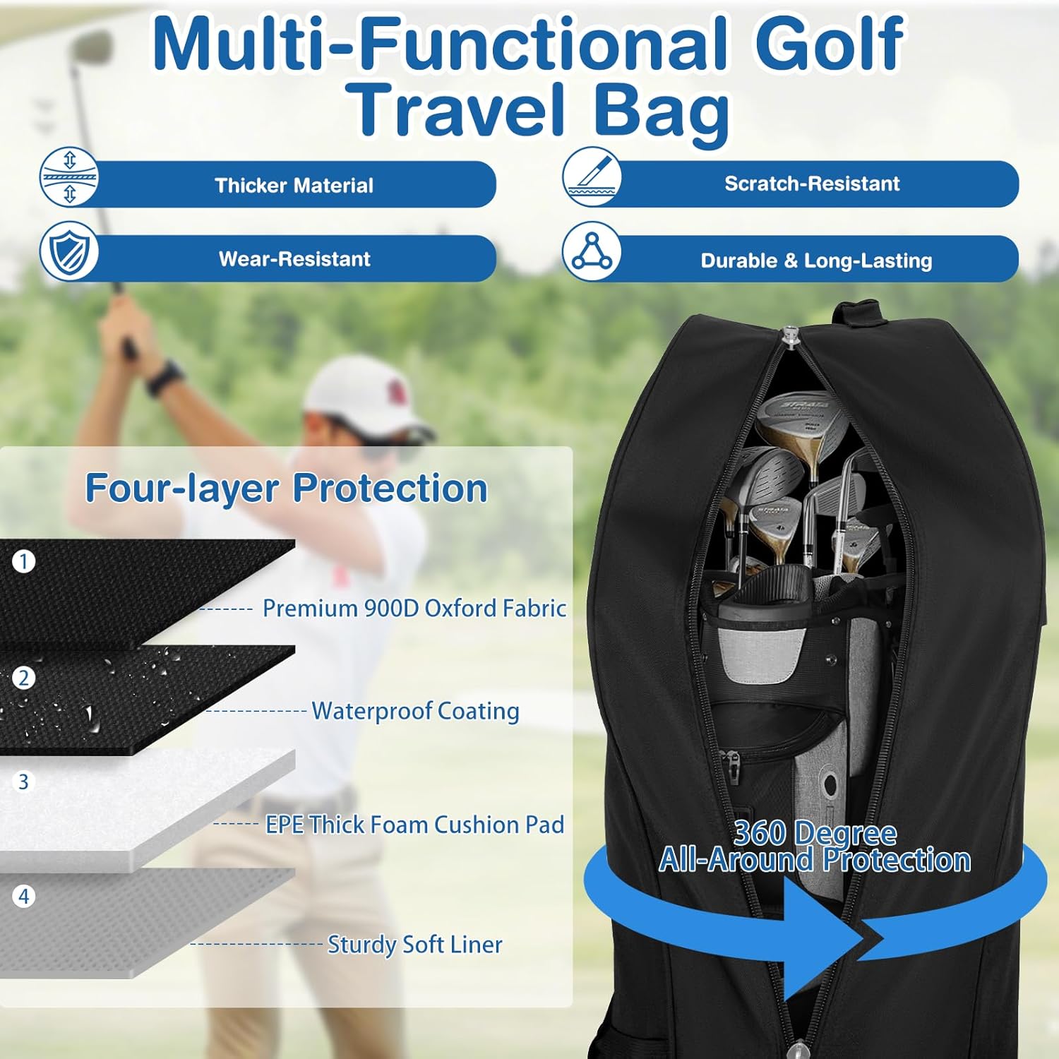 Lightweight & Long-Lasting - Made of premium 900D heavy duty polyester oxford, the golf travel bag offers durability with its thick, tear-resistant and abrasion-resistant construction. Thickened cushion layer on the head and security strap provide further protection for your golf clubs heads from collisions and damage