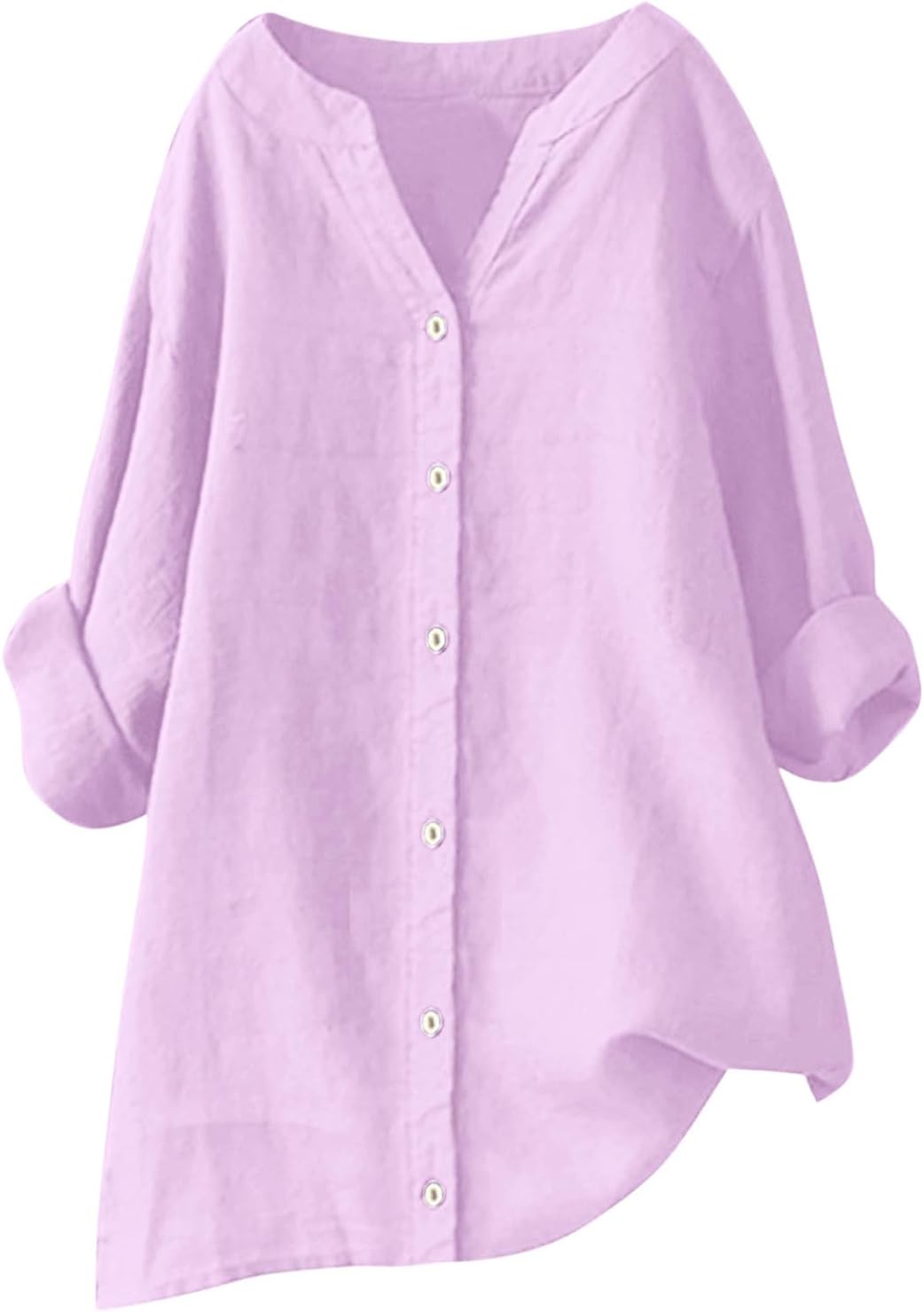 Linen Tops for Women Loose Fit Long Sleeve V Neck Shirts Casual Comfy Button Down Beach Vacation Tunic Blouses