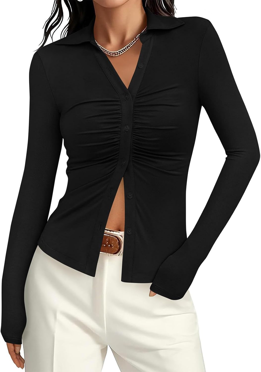 PRETTYGARDEN Womens Button Down Shirts V Neck Collared Ruched Slim Fit Long Sleeve Shirt Casual Fall Fashion Ladies Tops