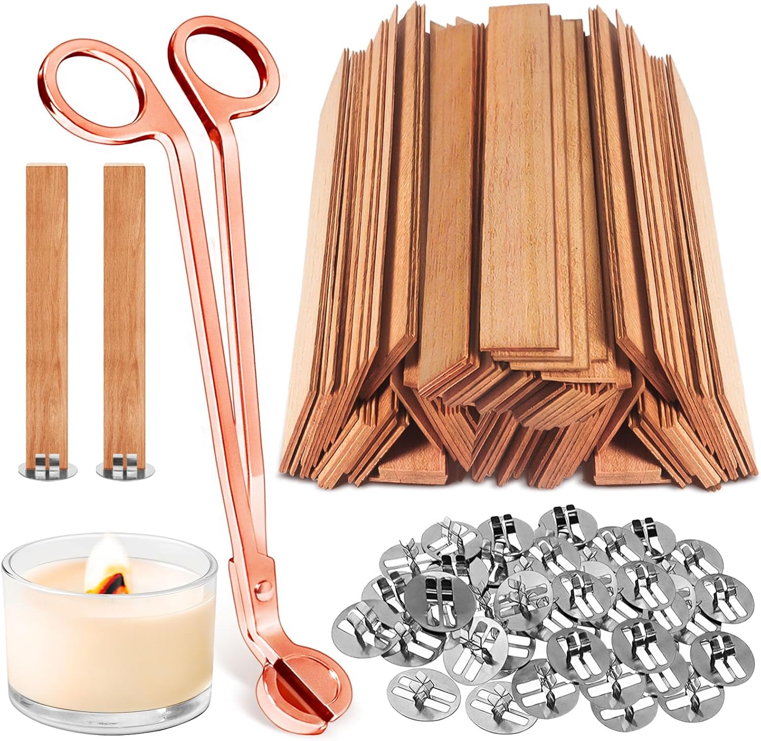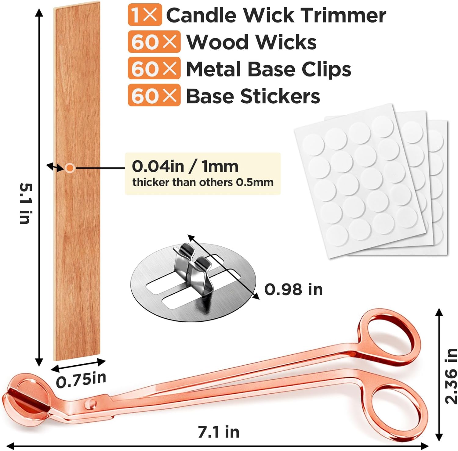 Package And Size: 60pcs natural candle wicks with 60 pcs metal base, 60pcs base stickers, and a rose gold candle wick trimmer. The size of each wood wick for candles making is 5.1 x 0.75x0.04 inches (13x1.9x0.1cm ), which is thicker than others. You can make a wider candle or just make a smaller one as long as you trim the wick.