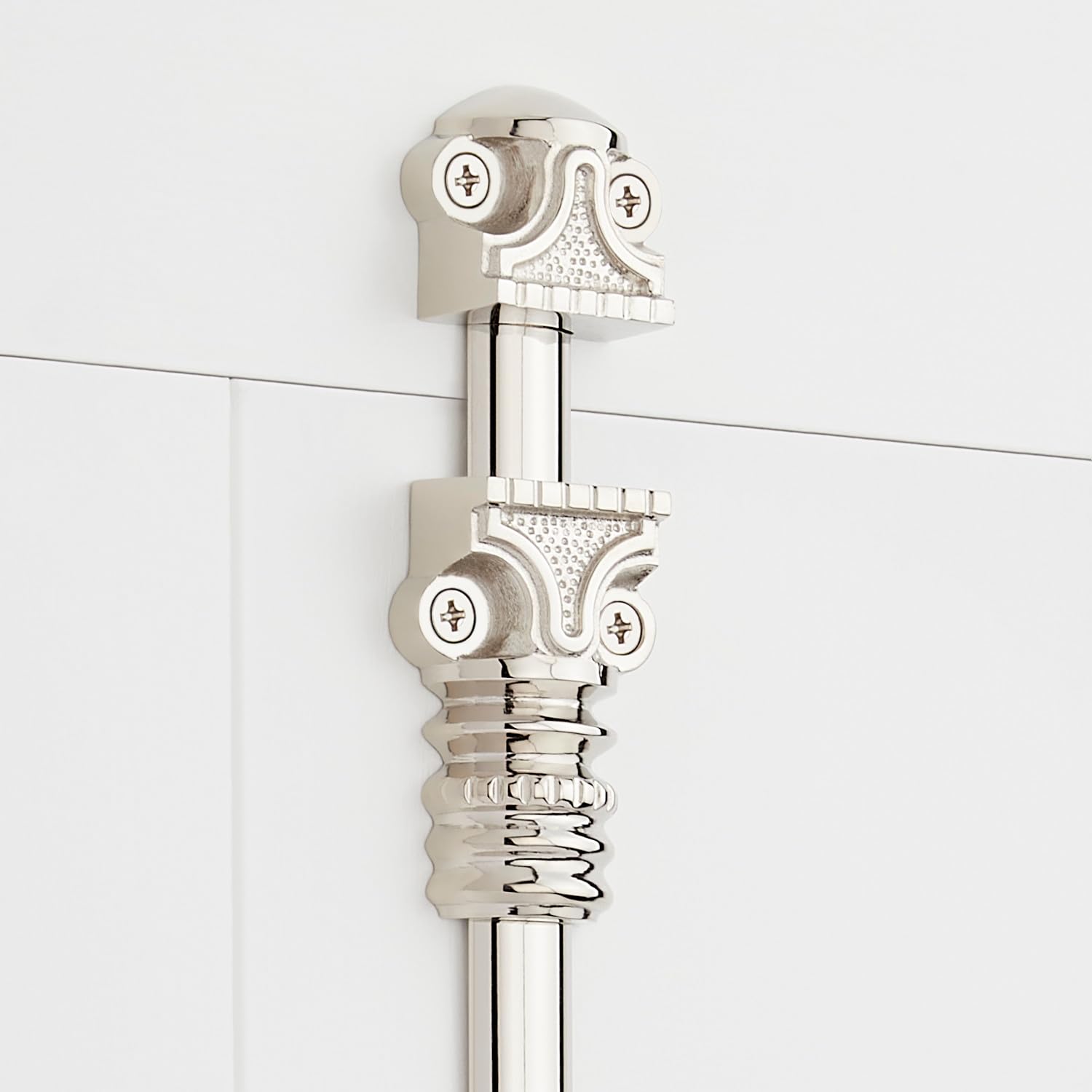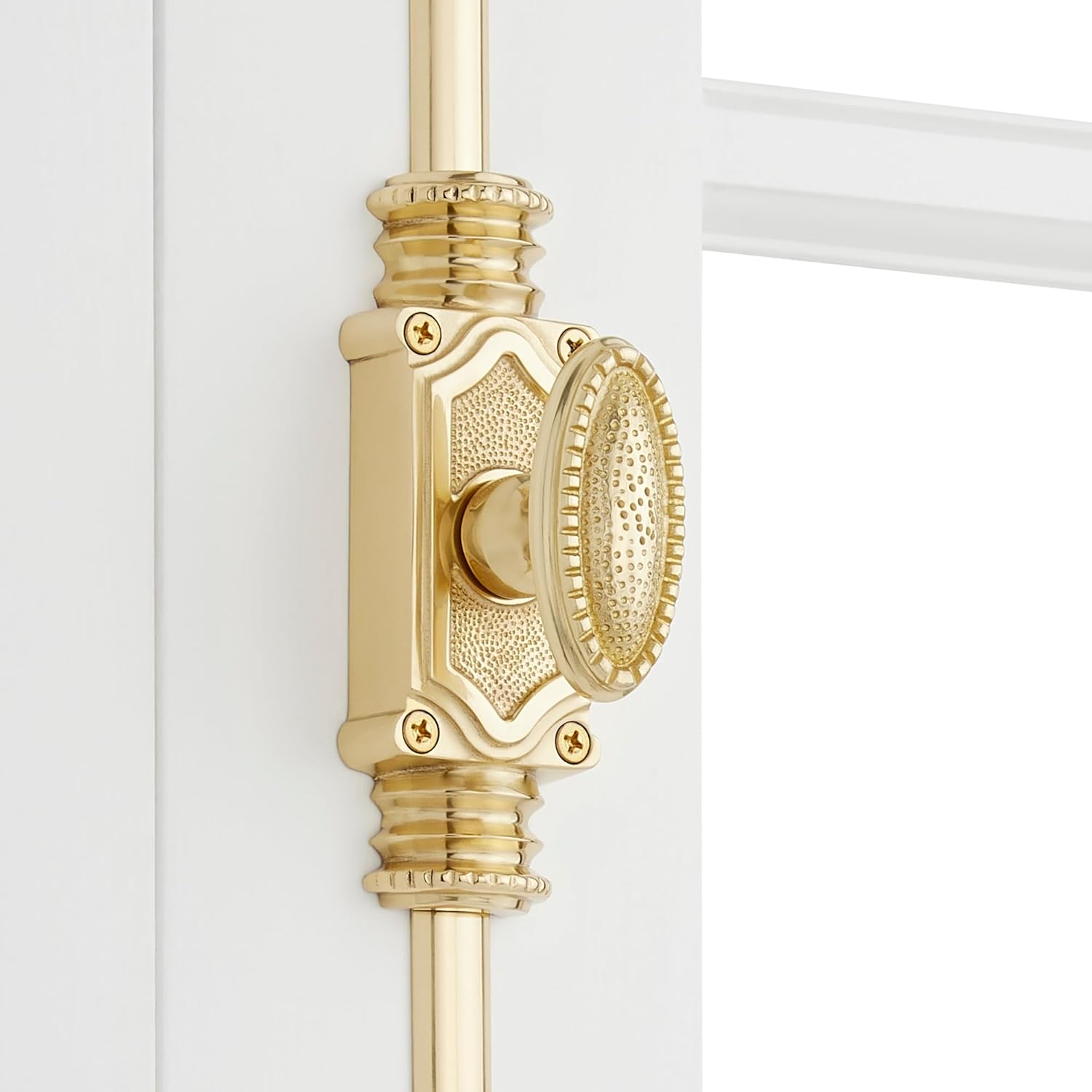 Secure cabinets, windows, and doors in stately sophistication with the Aldemer Brass Cremone Bolt. Crafted from solid brass with intricate detailing—including distinct beaded edges—the Aldemer brings wow factor and lasting durability to the littlest details. Sold individually. Signature Hardware 955209-1.5 Features: Covered under Signature Hardware's 10 year limited Constructed of brass Coordinates with products from the Aldemer line seamlessly Fits Cabinets up to two feet Rods can be customize by cutting the bolt rod to the desired length Rods can be cut down Signature Hardware 955209-1.5 Specifications: Height: 2" Width: 1-1/2" Depth: 2-1/16" Handing: Reversible Handle Projection: 1-1/4" Exterior Projection: 2-1/16"