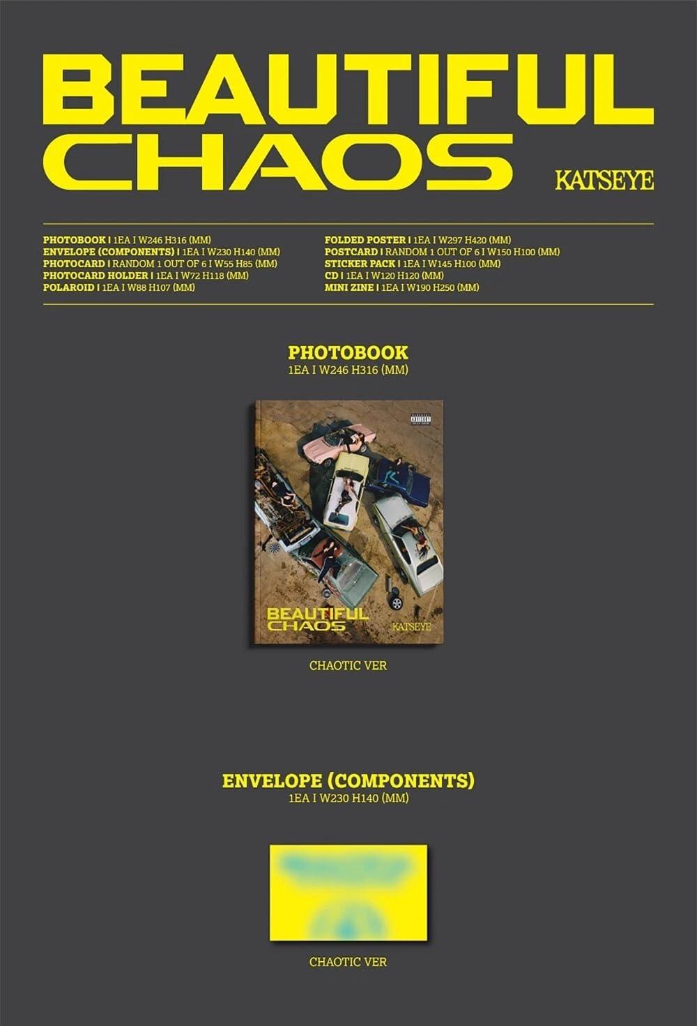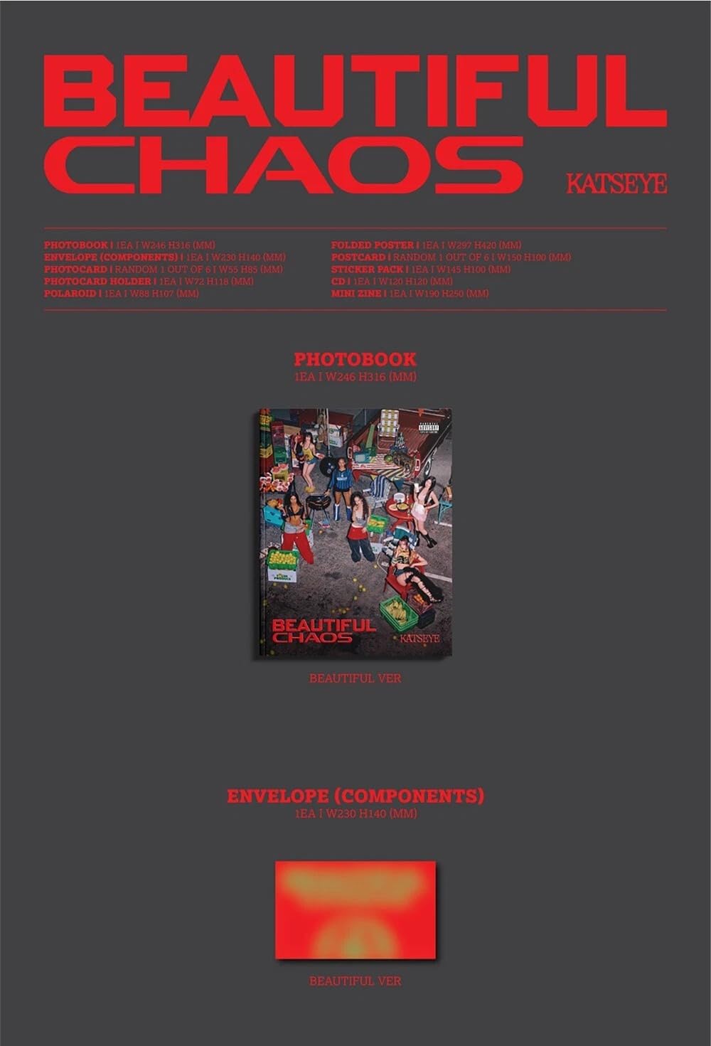 Album Product InformationOFFICIALLY DISTRIBUTED BRAND NEW & FACTORY SEALED. YOUR PURCHASE QUANTITY WILL BE COUNT ON KOREA. SYNNARA & HANTEO & CIRCLE & KBS MUSIC BANK K-POP CHART !!! Title : KATSEYE BEAUTIFUL CHAOS Album Artist : KATSEYE / KATS EYE Release Title : BEAUTIFUL CHAOS PRE ORDER DATE : Will release on 27th Jun, 2025 Condition : New 2 Ver Set Components : 2ea CD-R+2ea Photo Book+2ea Photo Card+2ea Photo Card Holder+2ea Polaroid Card +2ea Folded Poster(On pack)+2ea Post Card+2ea Sticker Pack+2ea Mini Zine Format : CD-R Label : HYBE UMG, LLC Country/Region of Manufacture : Korea, Republic of