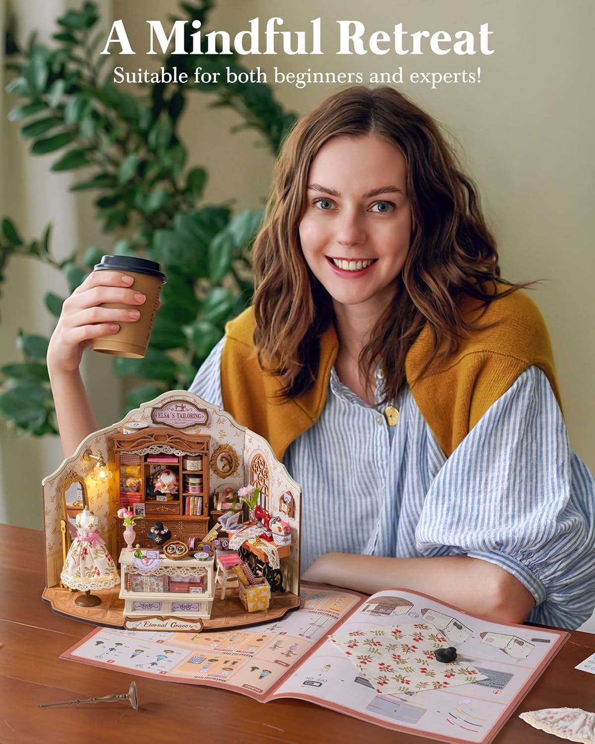 Rolife DIY Miniature House Kit Elsa's Tailoring 1:18 Scale Dollhouse Diorama, Tiny House Building Kit Vintage Tailor Shop Crafts for Adults Home Decor Gift for Adults