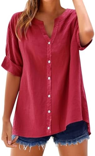Women Plus Size Tops Button Up Shirt Cotton Linen Short Sleeve Loose Fit Blouse V Neck Casual Beach Vacation Outfits