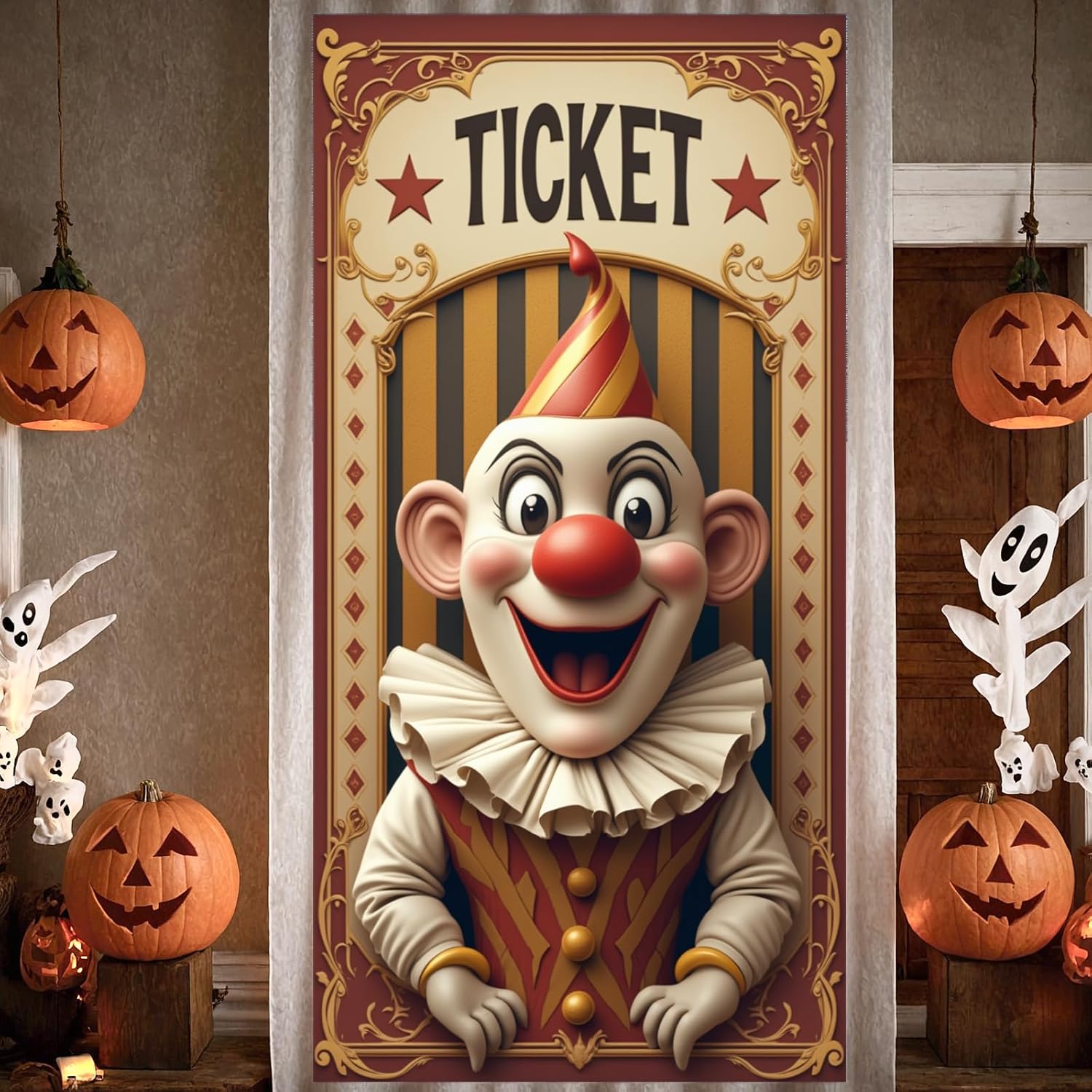 Halloween Evil Circus Door Banner Creepy Carnival Party Door Cover Scary Clown Halloween PartyDecorations for Festival Holiday Outdoor Indoor Wall Hanging Supplies 71 x 35 Inch