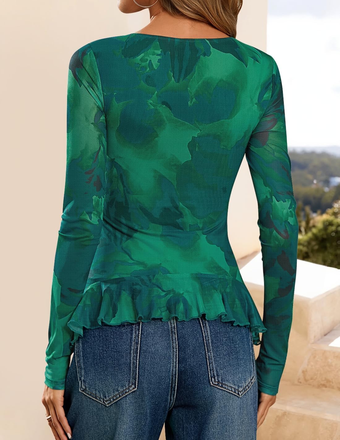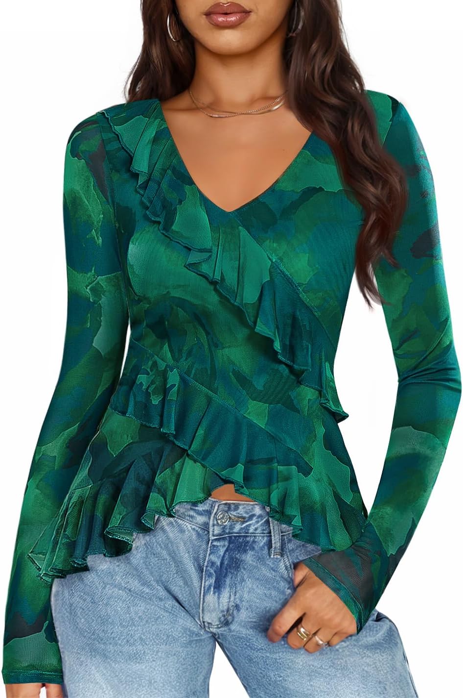 ZESICA Women's Long Sleeve Floral Shirts V Neck Going Out Ruffle Tops Blouses 2025 Fall Fashion Clothes Outfits