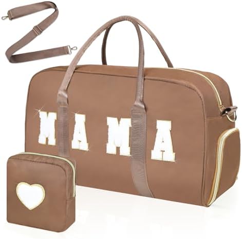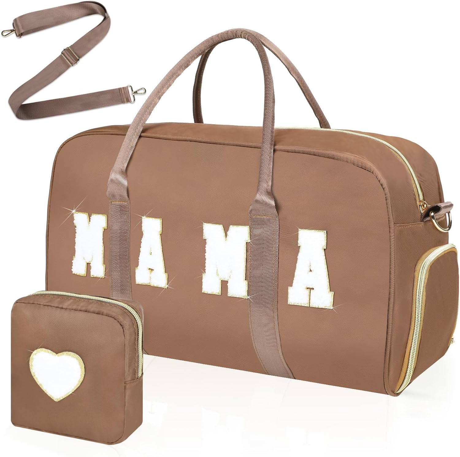Mama Hospital Bag for Women Labor and Delivery Nylon Chenille Letter Embroidered Duffle Overnight Weekender Bag with Shoes Compartment Mothers Day Gifts (Brown, Mama)
