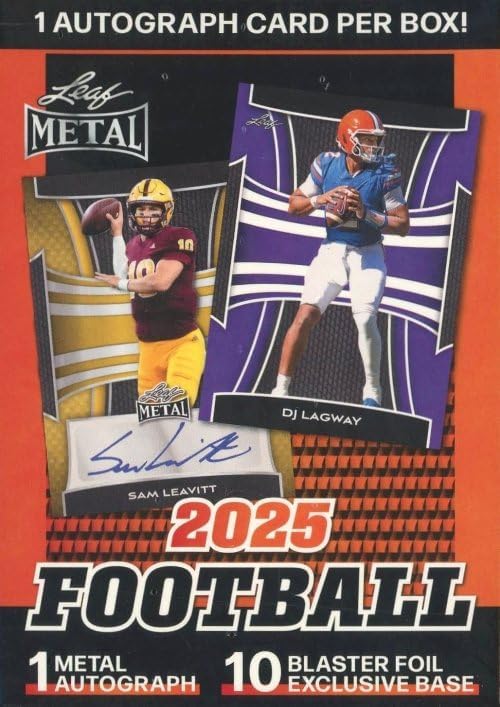 We are Proud to offer this Brand New 2025 Leaf METAL Football Factory Sealed Blaster Box! This EXCLUSIVE Factory Sealed Box Includes (10) Blaster FOIL EXCLUSIVE Base Cards & One METAL AUTOGRAPH! The hobby's favorite football brand returns for another season! 2025 Leaf Metal Football features the biggest names from not only the Draft, but also the biggest NIL names in the game. You'll also find legendary players and current pro superstars from the gridiron. Look for Cards & Autos of NFL Stars Including Peyton Manning, Patrick Mahomes, Jayden Daniels, Joe Montana and more! Look for Rookies & Rookie Autos of Cam Ward, Ashton Jeanty, Tetairoa McMillan, Shedeur Sanders, Dillon Gabriel, Tyler Shough, Jayden Daniels, DJ Lagway, Matthew Golden, Garrett Nussmeier & Many More! Good Luck with your Pulls!