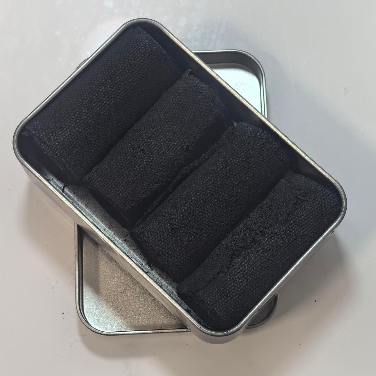 (4) Rolls of 2" wide x 19" long charcloth total 6 feet, in tin container 4 inches long x 2 3/4 inches wide x 4/5 inches deep . Hand made