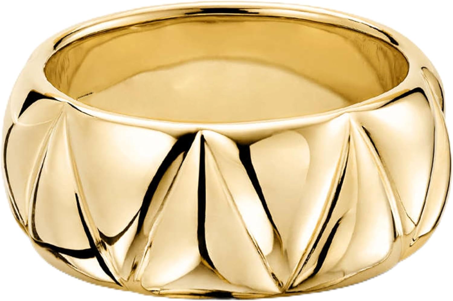 Chunky Ring 14K Gold Plated Wide Thumb Band with Croissant Carved Geometric Pleated Design Hypoallergenic Statement Jewelry for Women
