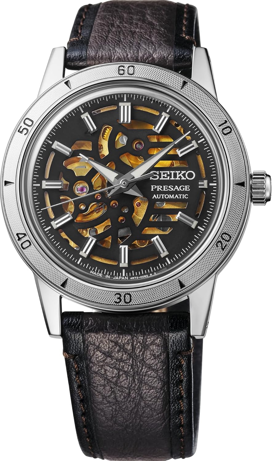 Seiko Automatic Men’s Watch from the Presage Style ’60s Collection. Offering the finest in Japanese mechanical watchmaking, the Presage Collection blends precision technology with superior craftsmanship and design. With broad angular lines and such vintage details as box-shaped crystals, faceted indices and sharp hand design, plus the use of neutrals and earth tones, the Style ’60s collection creates a warm, retro feel perfect for today. Celebrating the fresh spirit of the 1960s, the collection takes particular inspiration from Seiko’s 1964 “Crown Chronograph,” Japan’s first watch with a stopwatch function. The black open-aperture dial, featuring a 24-hour subdial and beige Lumi-Brite hands and markers, offers a view of the 24-jewel movement, which beats at a frequency of 21,600 vibrations per hour, providing a power reserve of approximately 41 hours and manual winding capability. Crafted of stainless steel, this distinctive timepiece includes a screwdown see-through caseback and tri-fold push button release clasp. Water-resistant to 50 meters.